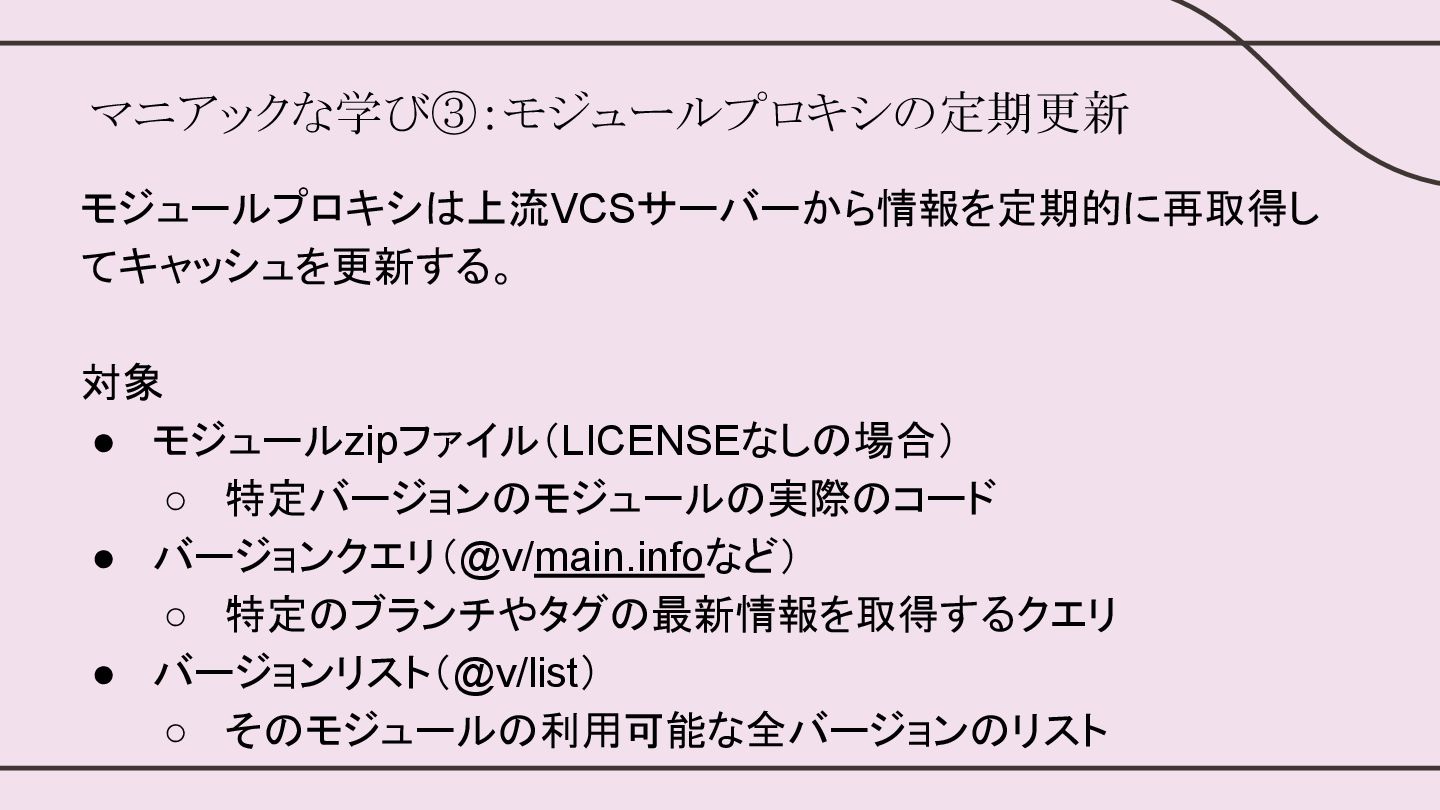 7. マニアックな学び③:モジュールプロキシの定期更新 例)3日に1回アクセスされるモジュールのバージョンリストの最悪のパターン = 1リクエスト → 3日間の更新を正当化 = 3日 × 24時間