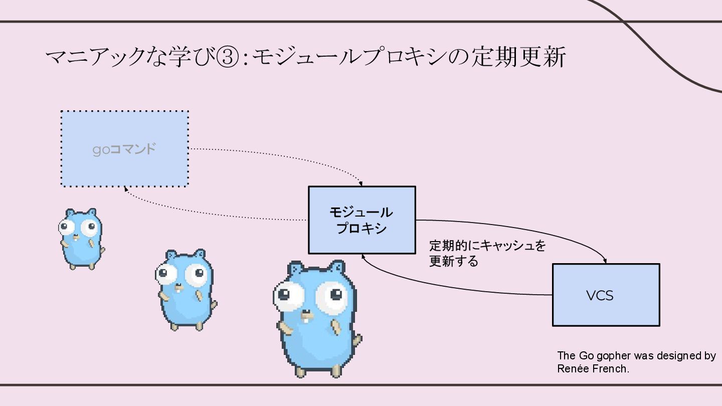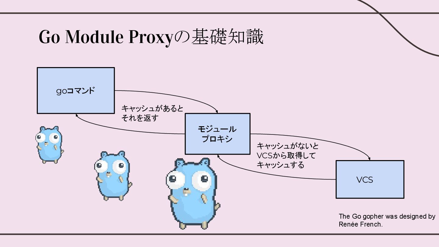 キャッシュがないと VCSから取得して キャッシュする The Go gopher was designed by Renée French.