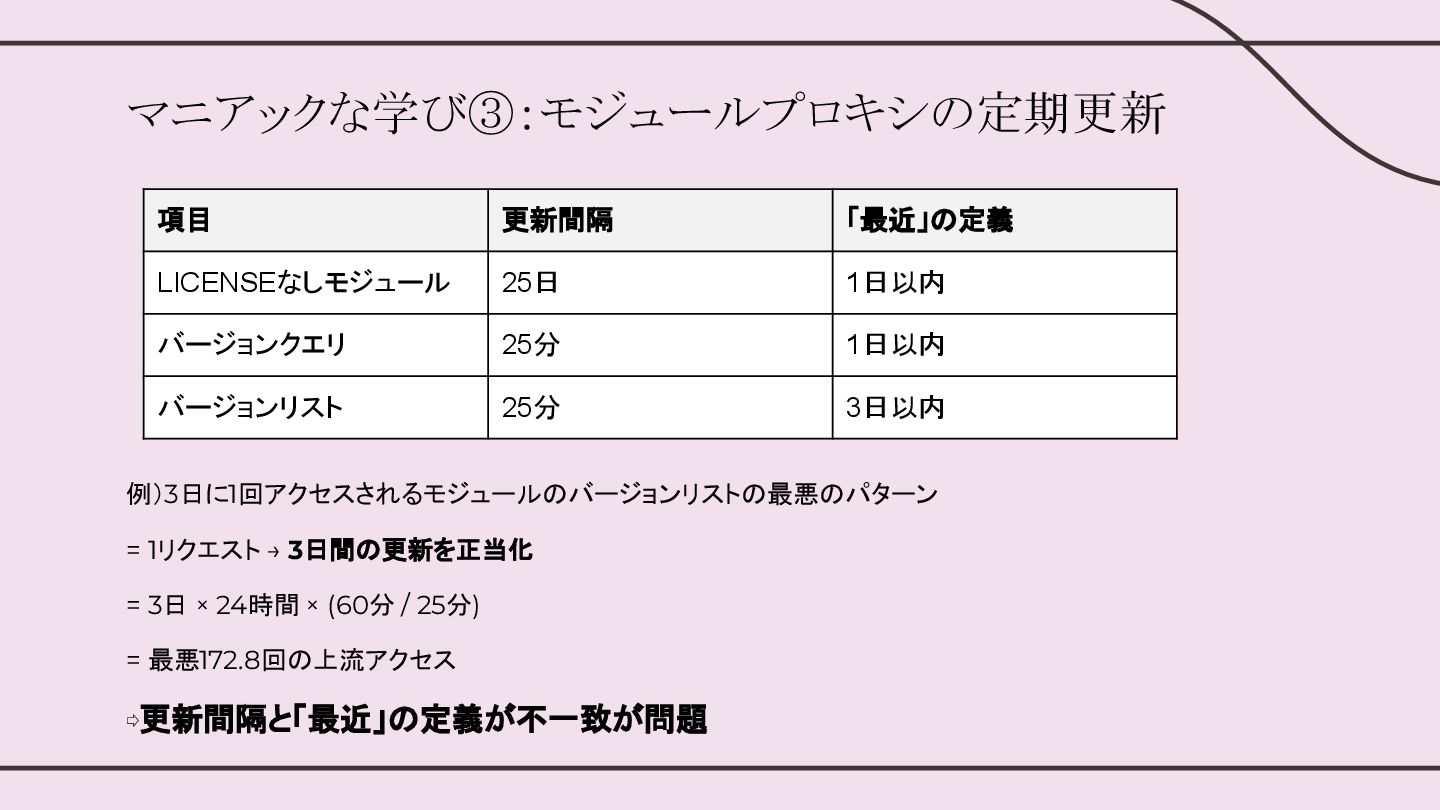× (60分 / 25分) = 最悪172.8回の上流アクセス ⇨更新間隔と「最近」の定義が不一致が問題 項目 更新間隔 「最近」の定義 LICENSEなしモジュール 25日 1日以内 バージョンクエリ 25分 1日以内 バージョンリスト 25分 3日以内