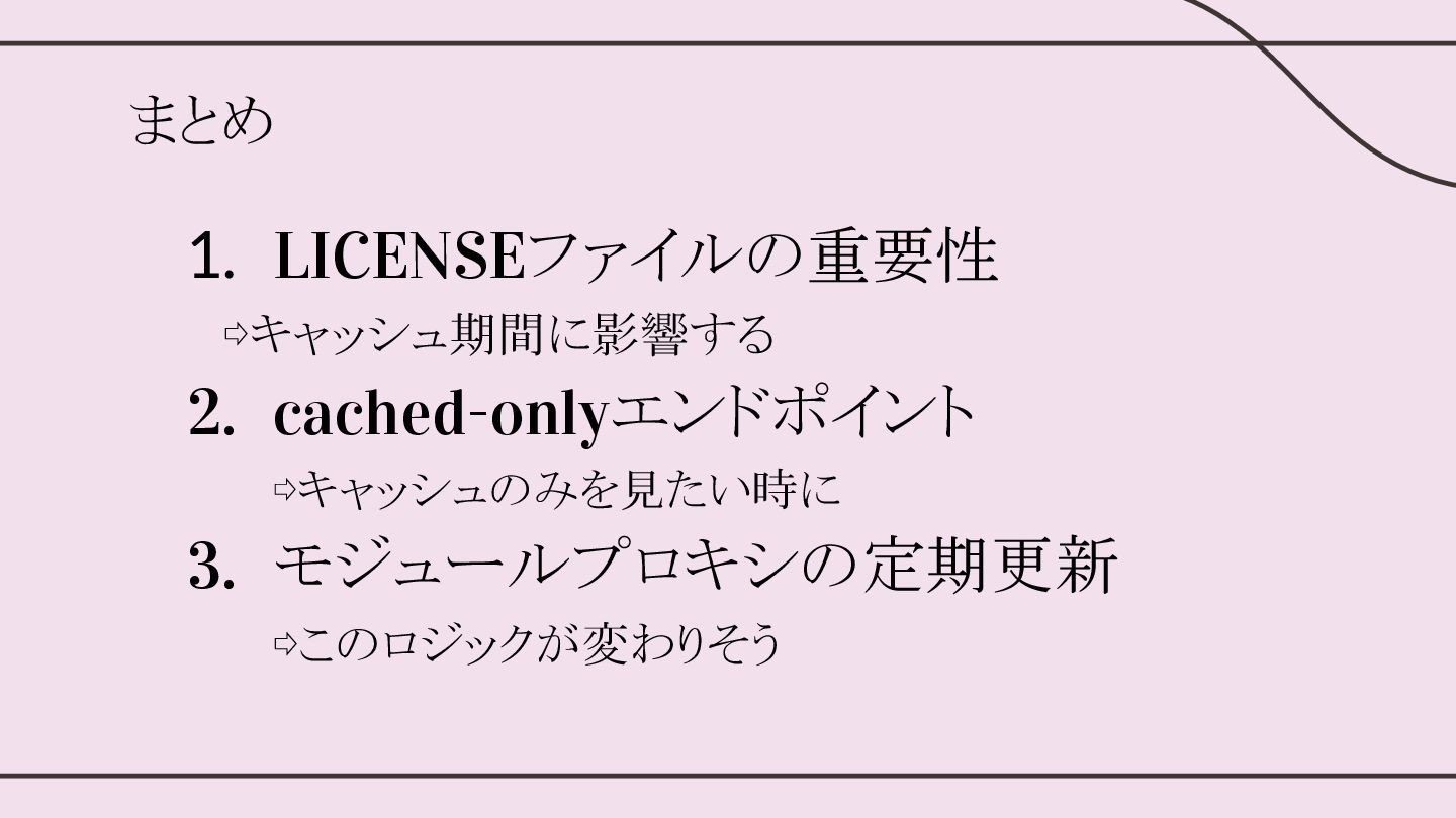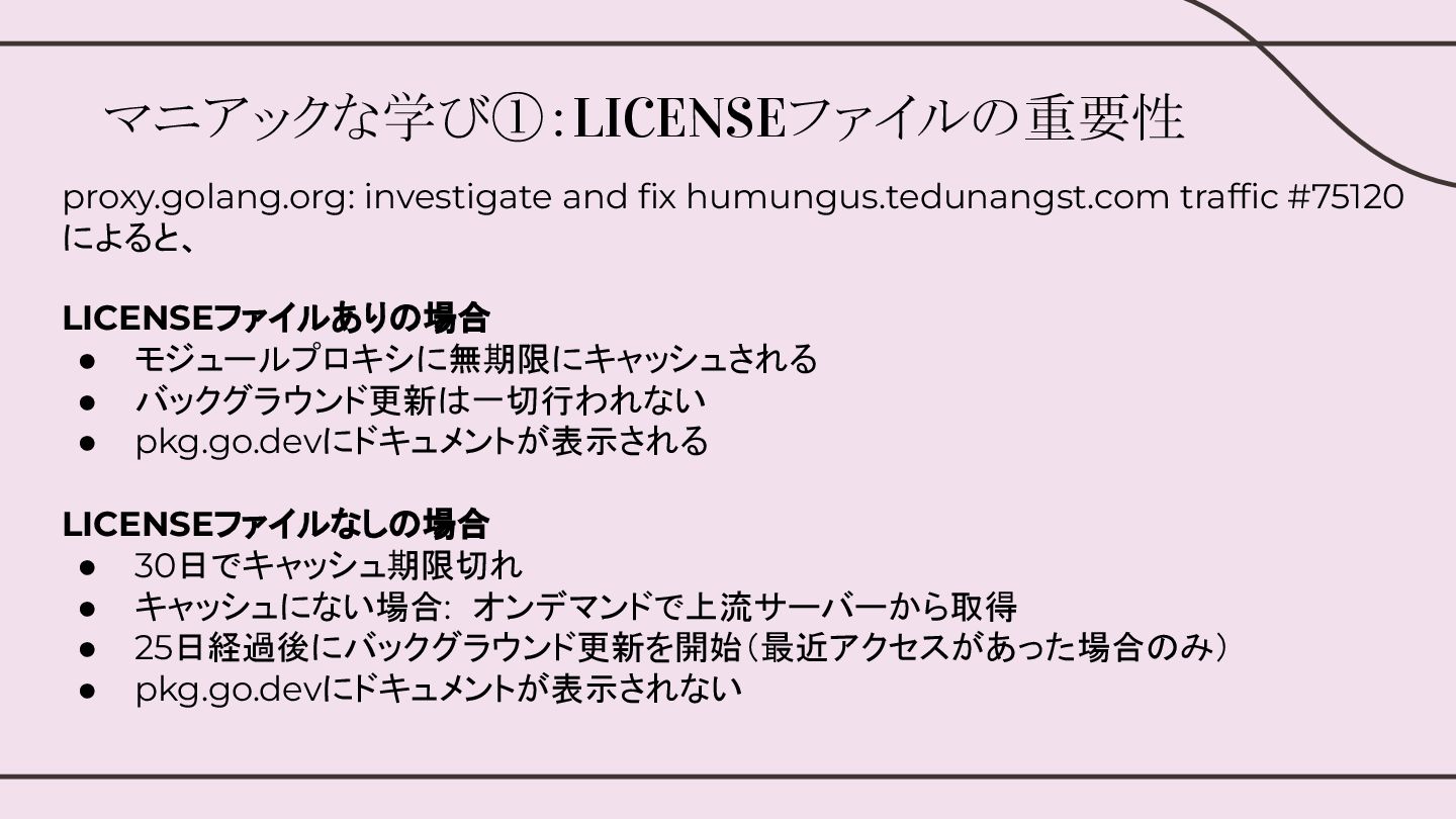 • モジュールプロキシに無期限にキャッシュされる • バックグラウンド更新は一切行われない • pkg.go.devにドキュメントが表示される LICENSEファイルなしの場合 • 30日でキャッシュ期限切れ • キャッシュにない場合: オンデマンドで上流サーバーから取得 • 25日経過後にバックグラウンド更新を開始(最近アクセスがあった場合のみ) • pkg.go.devにドキュメントが表示されない