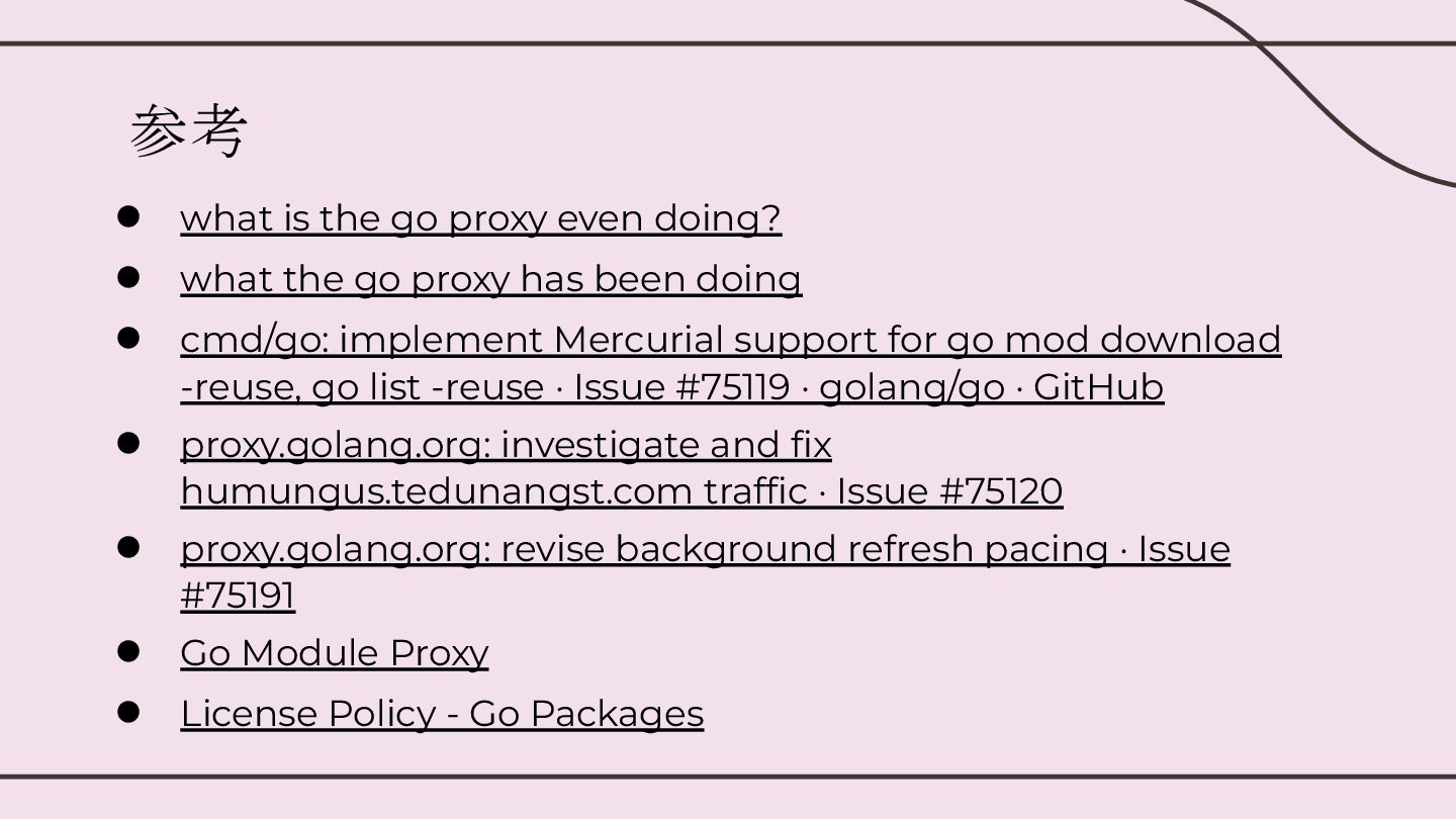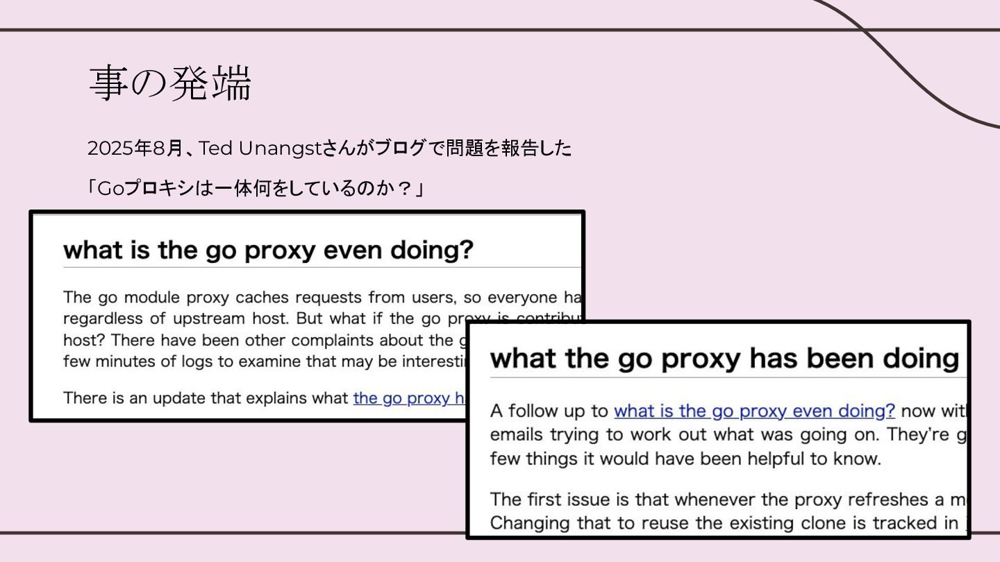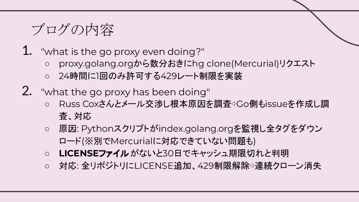 proxy.golang.orgから数分おきにhg clone(Mercurial)リクエスト ◦ 24時間に1回のみ許可する429レート制限を実装 2. "what the go proxy has been doing" ◦ Russ Coxさんとメール交渉し根本原因を調査⇨Go側もissueを作成し調 査、対応 ◦ 原因: Pythonスクリプトがindex.golang.orgを監視し全タグをダウン ロード(※別でMercurialに対応できていない問題も) ◦ LICENSEファイルがないと30日でキャッシュ期限切れと判明 ◦ 対応: 全リポジトリにLICENSE追加、429制限解除⇨連続クローン消失