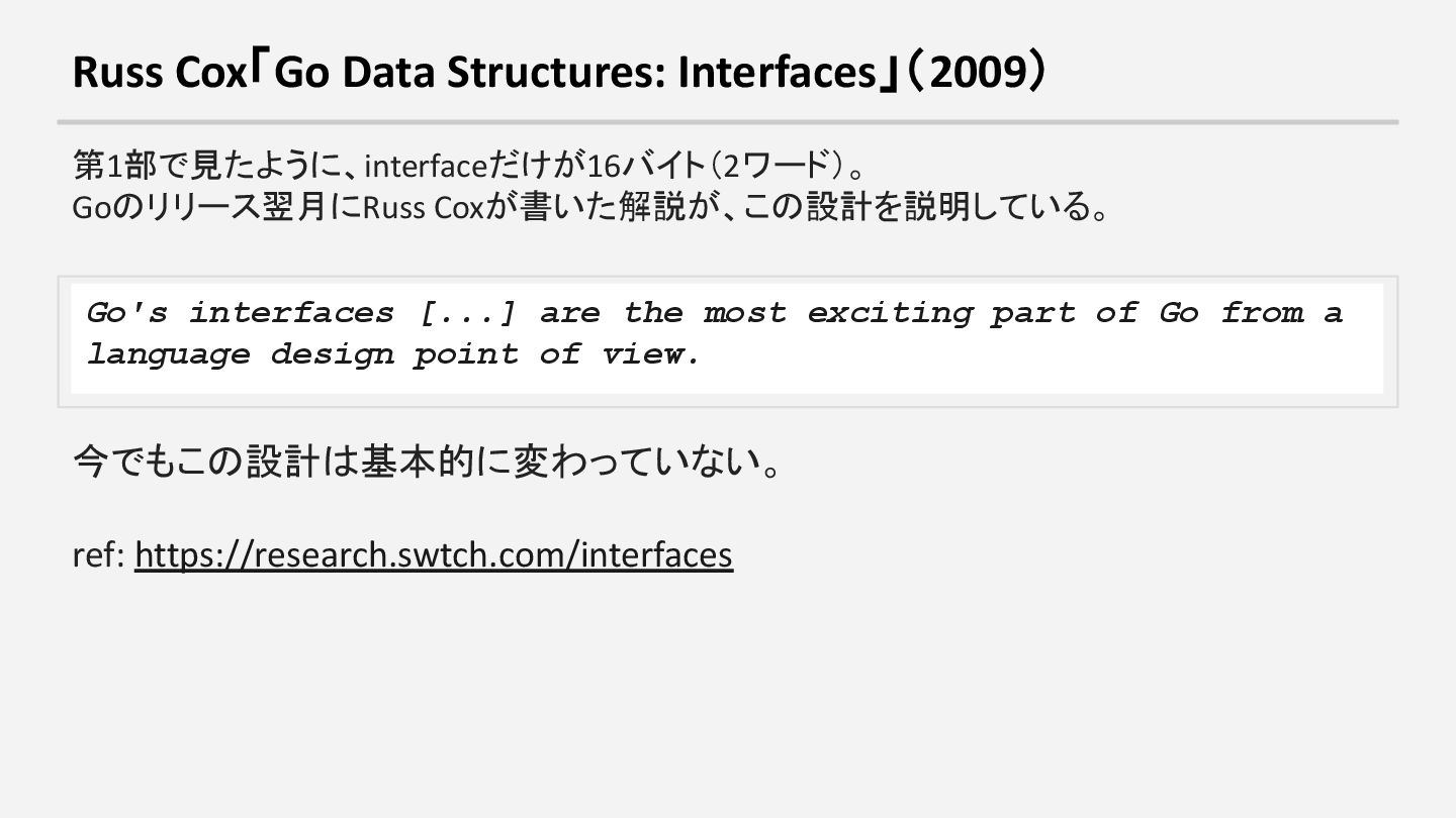 7. Russ Cox「Go Data Structures: Interfaces」(2009) 第1部で見たように、interfaceだけが16バイト(2ワード)。 Goのリリース翌月にRuss Coxが書いた解説が、この設計を説明している。 Go's interfaces