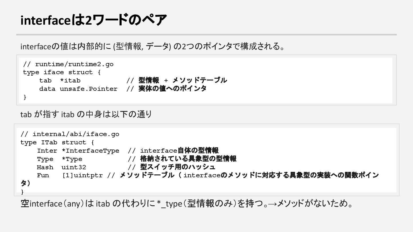 { tab *itab // 型情報 + メソッドテーブル data unsafe.Pointer // 実体の値へのポインタ } tab が指す itab の中身は以下の通り // internal/abi/iface.go type ITab struct { Inter *InterfaceType // interface自体の型情報 Type *Type // 格納されている具象型の型情報 Hash uint32 // 型スイッチ用のハッシュ Fun [1]uintptr // メソッドテーブル( interfaceのメソッドに対応する具象型の実装への関数ポイン タ) } 空interface(any)は itab の代わりに *_type(型情報のみ)を持つ。→メソッドがないため。