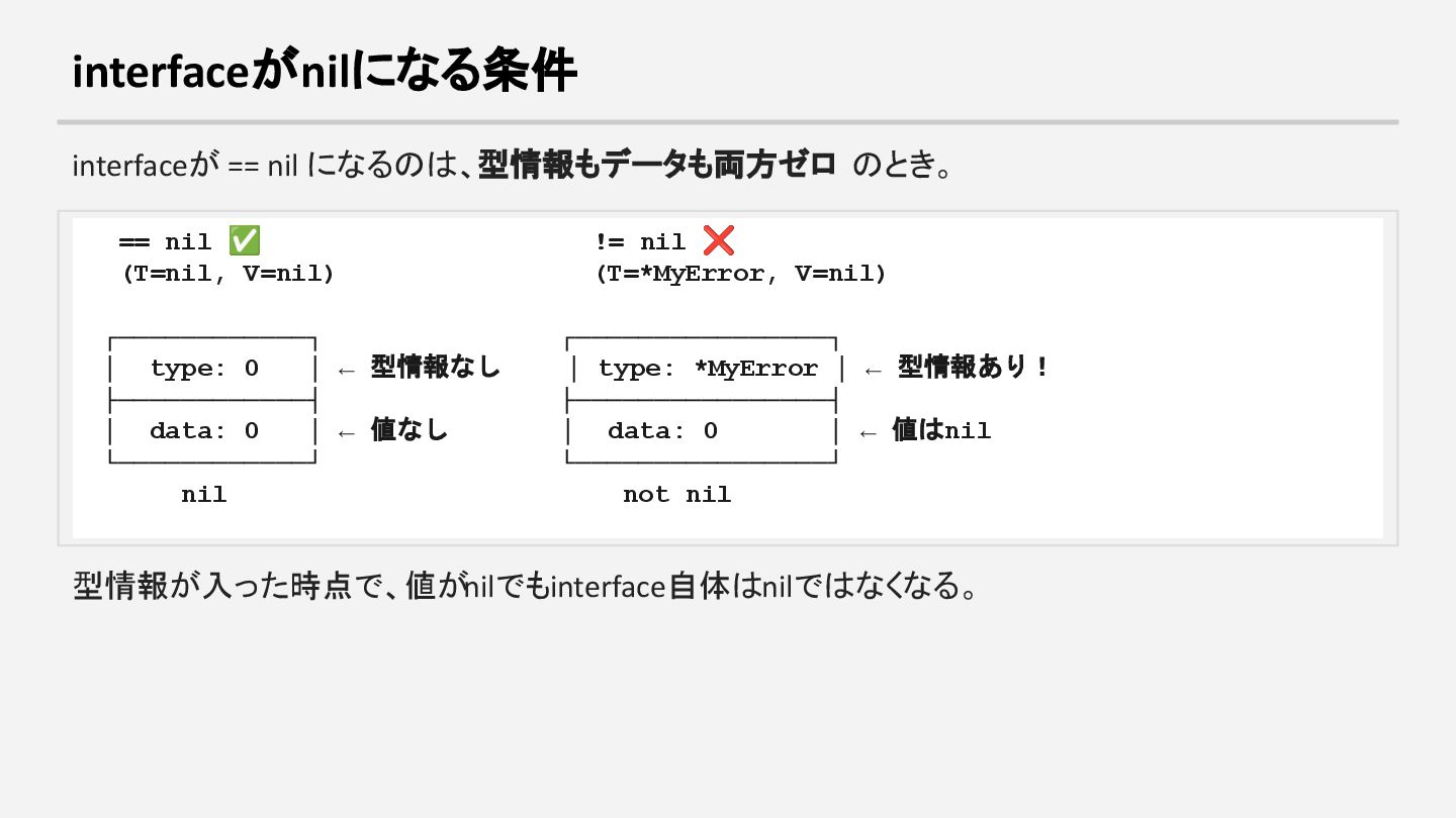 nil ❌ (T=nil, V=nil) (T=*MyError, V=nil) ┌────────────┐ ┌────────────────┐ │ type: 0 │ ← 型情報なし │ type: *MyError │ ← 型情報あり! ├────────────┤ ├────────────────┤ │ data: 0 │ ← 値なし │ data: 0 │ ← 値はnil └────────────┘ └────────────────┘ nil not nil 型情報が入った時点で、値がnilでもinterface自体はnilではなくなる。