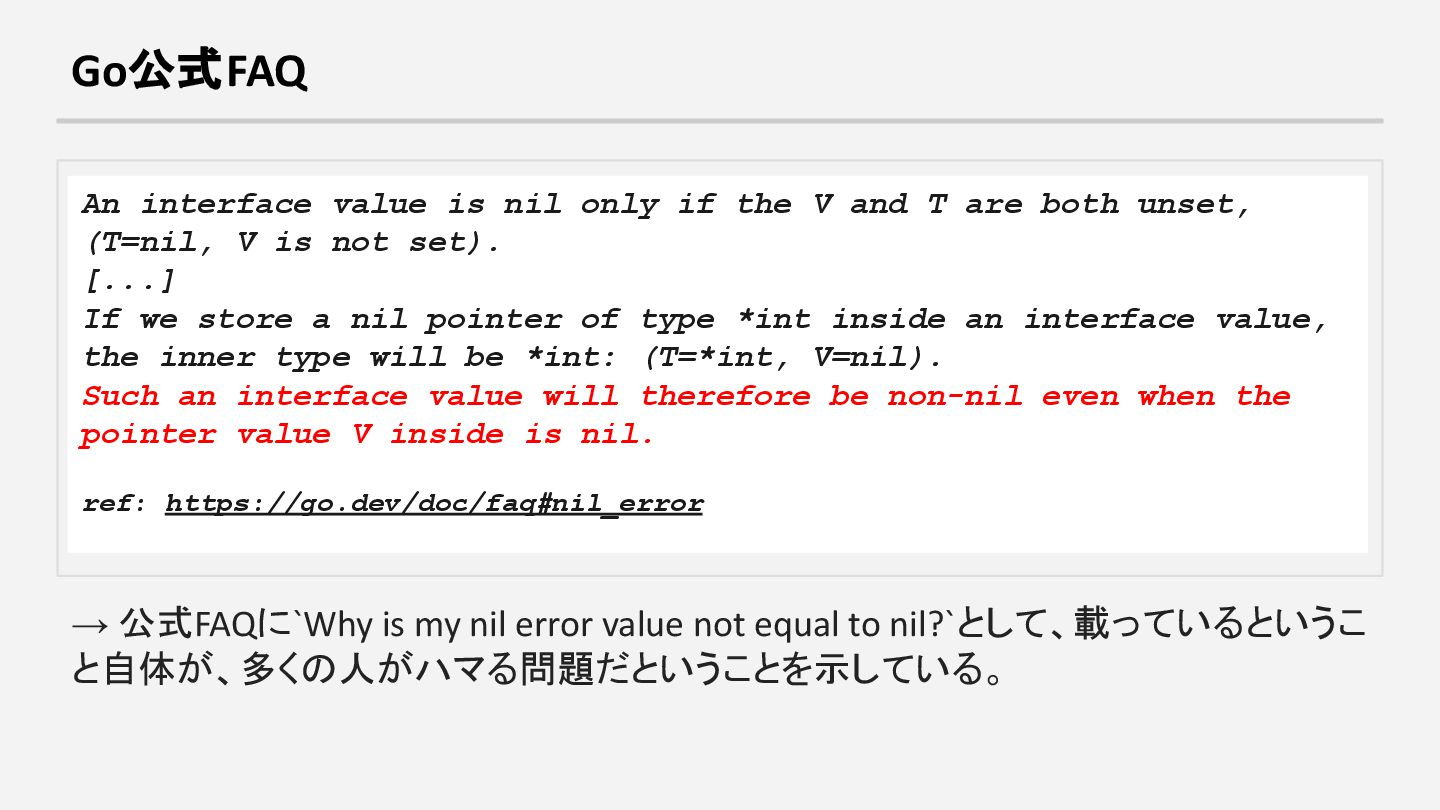 and T are both unset, (T=nil, V is not set). [...] If we store a nil pointer of type *int inside an interface value, the inner type will be *int: (T=*int, V=nil). Such an interface value will therefore be non-nil even when the pointer value V inside is nil. ref: https://go.dev/doc/faq#nil_error → 公式FAQに`Why is my nil error value not equal to nil?`として、載っているというこ と自体が、多くの人がハマる問題だということを示している。