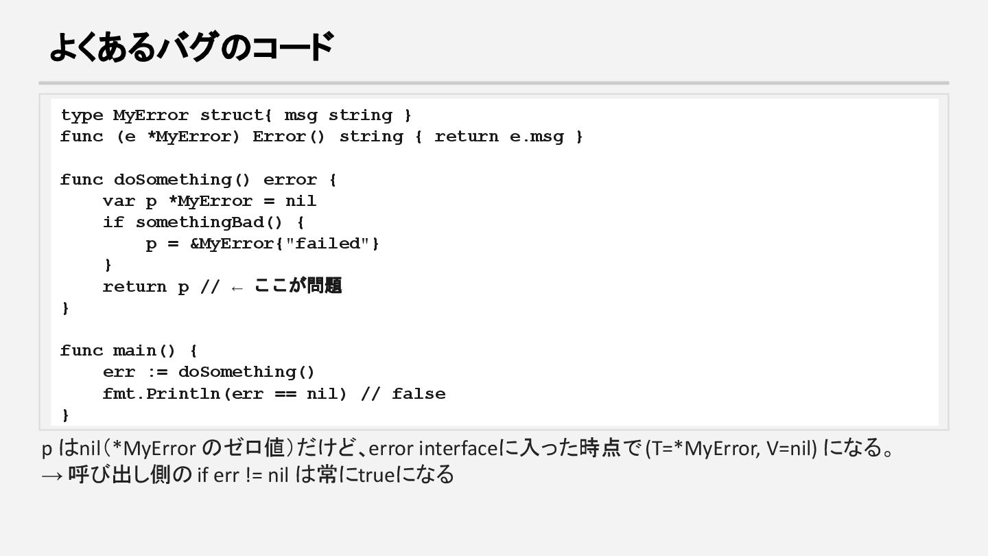 Error() string { return e.msg } func doSomething() error { var p *MyError = nil if somethingBad() { p = &MyError{"failed"} } return p // ← ここが問題 } func main() { err := doSomething() fmt.Println(err == nil) // false } p はnil(*MyError のゼロ値)だけど、error interfaceに入った時点で (T=*MyError, V=nil) になる。 → 呼び出し側の if err != nil は常にtrueになる