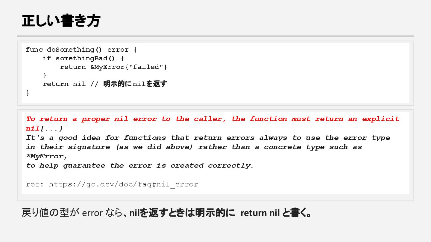 } return nil // 明示的にnilを返す } To return a proper nil error to the caller, the function must return an explicit nil[...] It's a good idea for functions that return errors always to use the error type in their signature (as we did above) rather than a concrete type such as *MyError, to help guarantee the error is created correctly. ref: https://go.dev/doc/faq#nil_error 戻り値の型が error なら、nilを返すときは明示的に return nil と書く。