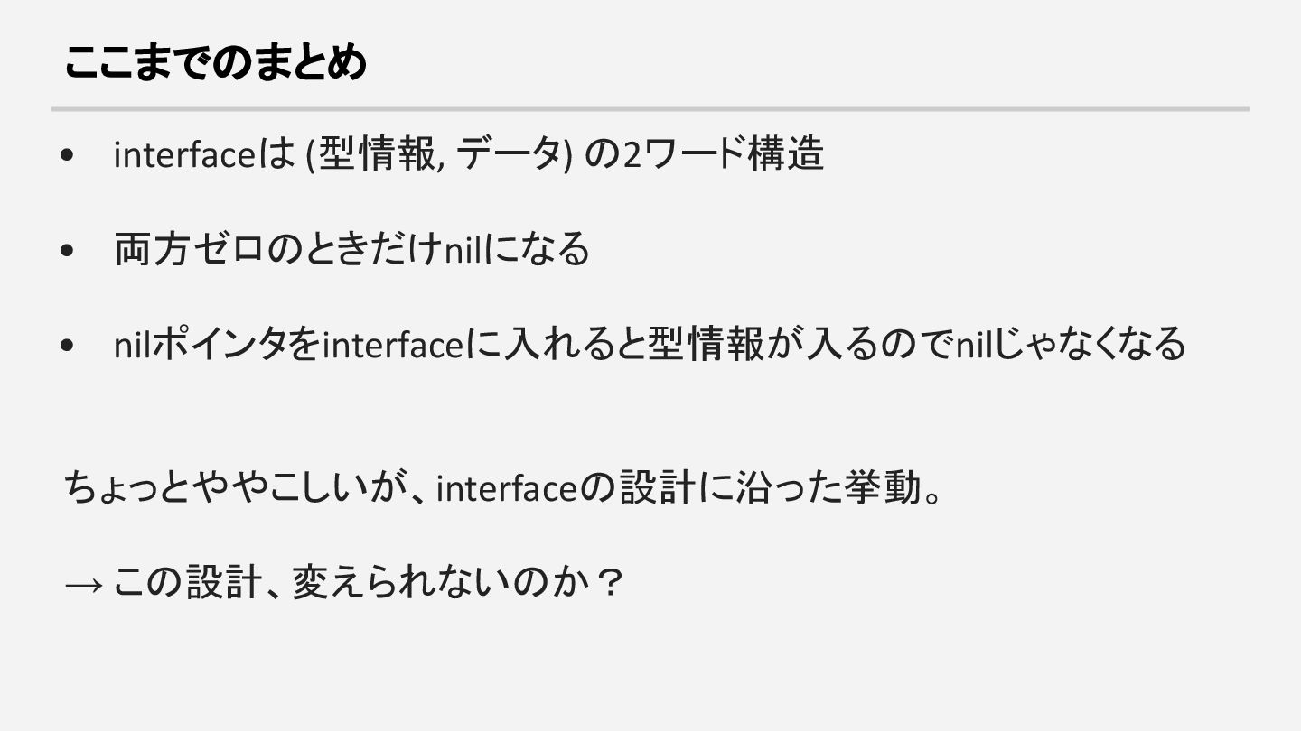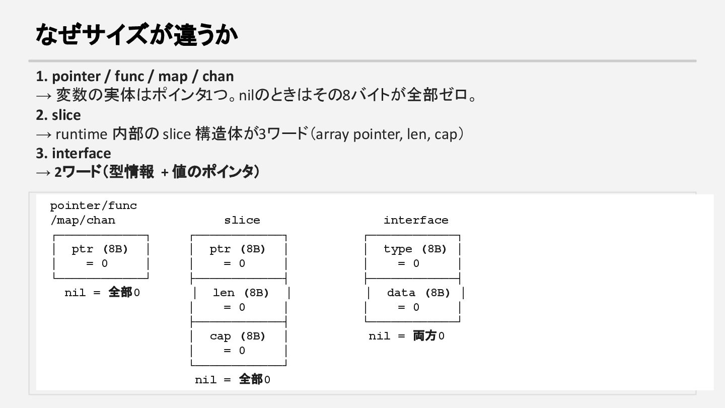 変数の実体はポインタ1つ。nilのときはその8バイトが全部ゼロ。 2. slice → runtime 内部の slice 構造体が3ワード(array pointer, len, cap) 3. interface → 2ワード(型情報 + 値のポインタ) pointer/func /map/chan slice interface ┌────────────┐ ┌────────────┐ ┌────────────┐ │ ptr (8B) │ │ ptr (8B) │ │ type (8B) │ │ = 0 │ │ = 0 │ │ = 0 │ └────────────┘ ├────────────┤ ├────────────┤ nil = 全部0 │ len (8B) │ │ data (8B) │ │ = 0 │ │ = 0 │ ├────────────┤ └────────────┘ │ cap (8B) │ nil = 両方0 │ = 0 │ └────────────┘ nil = 全部0