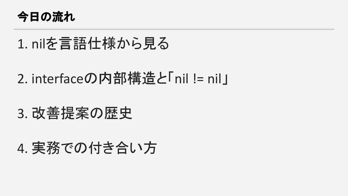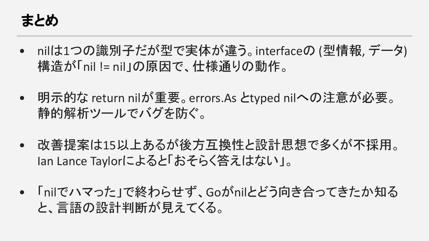 return nilが重要。errors.As とtyped nilへの注意が必要。 静的解析ツールでバグを防ぐ。 • 改善提案は15以上あるが後方互換性と設計思想で多くが不採用。 Ian Lance Taylorによると「おそらく答えはない」。 • 「nilでハマった」で終わらせず、Goがnilとどう向き合ってきたか知る と、言語の設計判断が見えてくる。