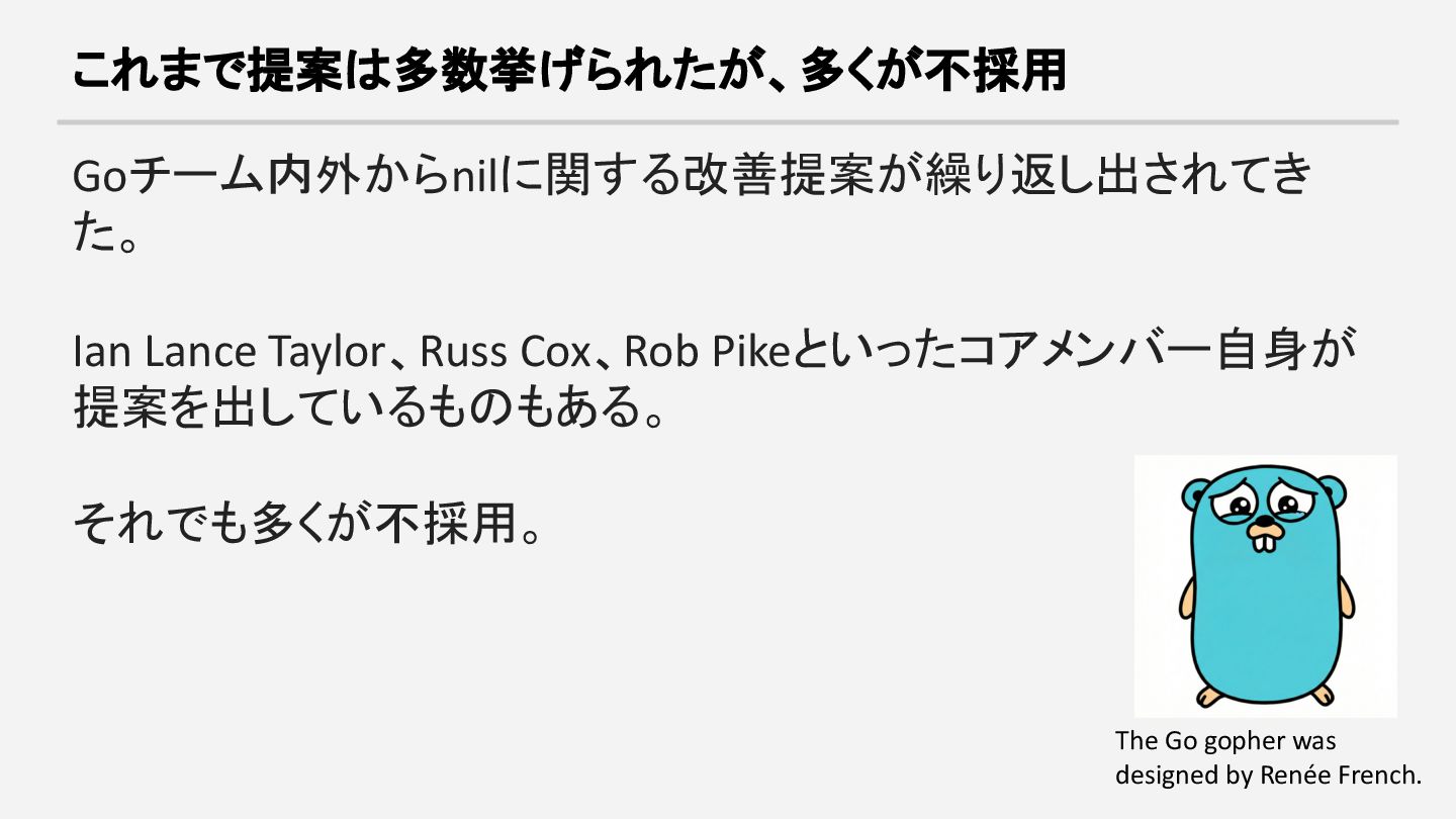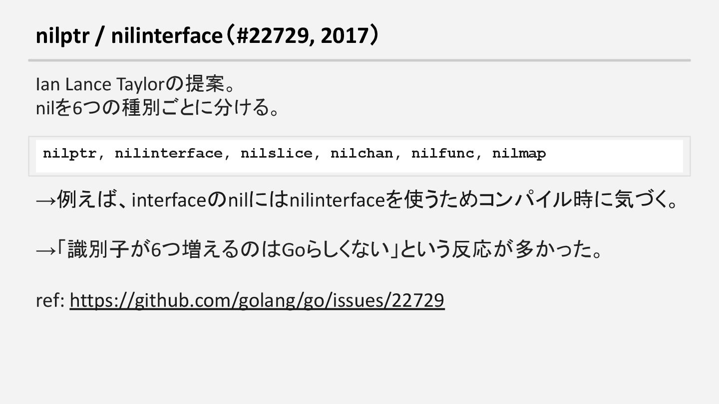 nilslice, nilchan, nilfunc, nilmap →例えば、interfaceのnilにはnilinterfaceを使うためコンパイル時に気づく。 →「識別子が6つ増えるのはGoらしくない」という反応が多かった。 ref: https://github.com/golang/go/issues/22729
