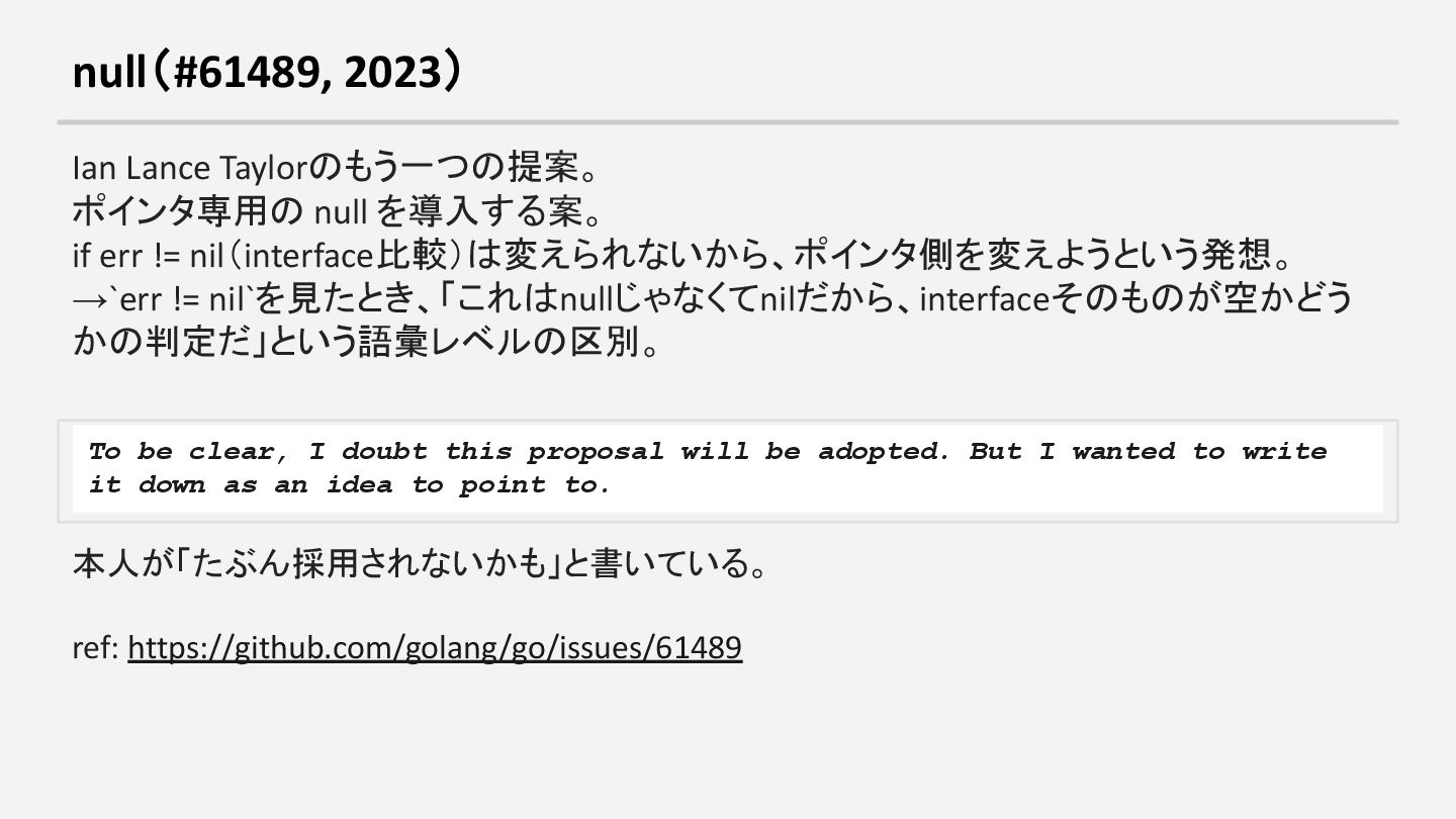 != nil(interface比較)は変えられないから、ポインタ側を変えようという発想。 →`err != nil`を見たとき、「これはnullじゃなくてnilだから、interfaceそのものが空かどう かの判定だ」という語彙レベルの区別。 To be clear, I doubt this proposal will be adopted. But I wanted to write it down as an idea to point to. 本人が「たぶん採用されないかも」と書いている。 ref: https://github.com/golang/go/issues/61489