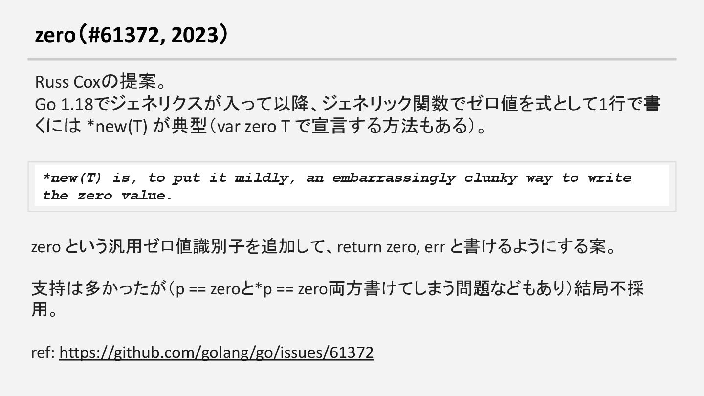 T で宣言する方法もある)。 *new(T) is, to put it mildly, an embarrassingly clunky way to write the zero value. zero という汎用ゼロ値識別子を追加して、return zero, err と書けるようにする案。 支持は多かったが(p == zeroと*p == zero両方書けてしまう問題などもあり)結局不採 用。 ref: https://github.com/golang/go/issues/61372