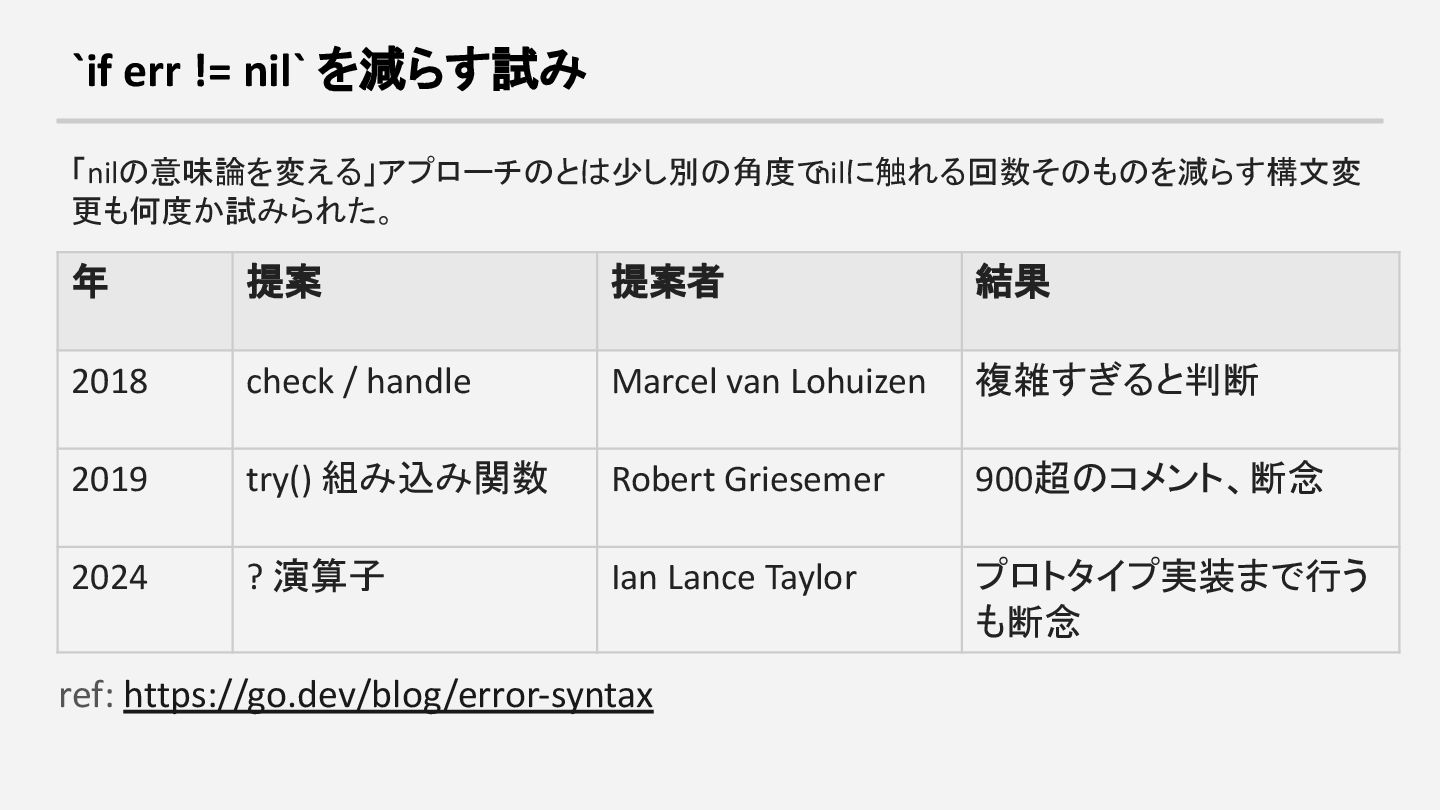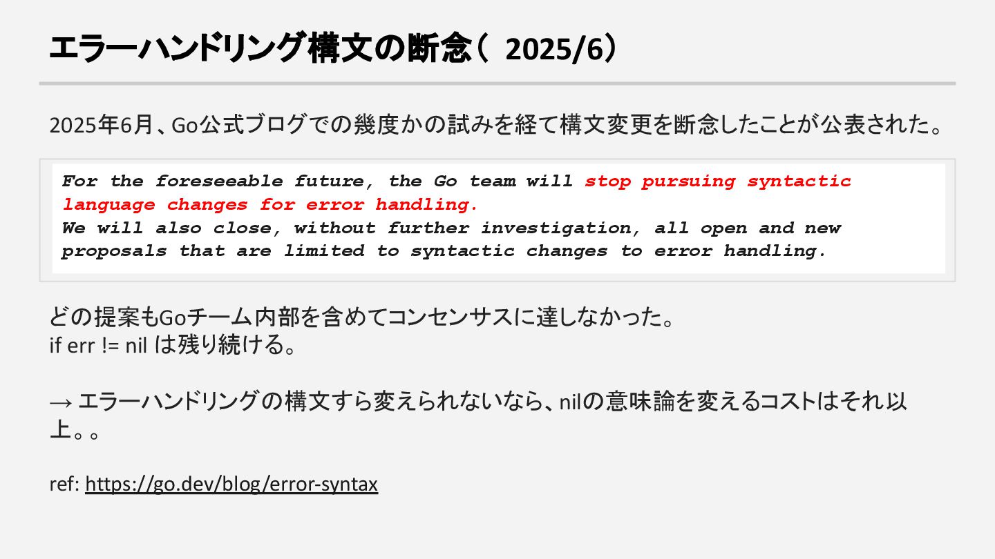 will stop pursuing syntactic language changes for error handling. We will also close, without further investigation, all open and new proposals that are limited to syntactic changes to error handling. どの提案もGoチーム内部を含めてコンセンサスに達しなかった。 if err != nil は残り続ける。 → エラーハンドリングの構文すら変えられないなら、nilの意味論を変えるコストはそれ以 上。。 ref: https://go.dev/blog/error-syntax