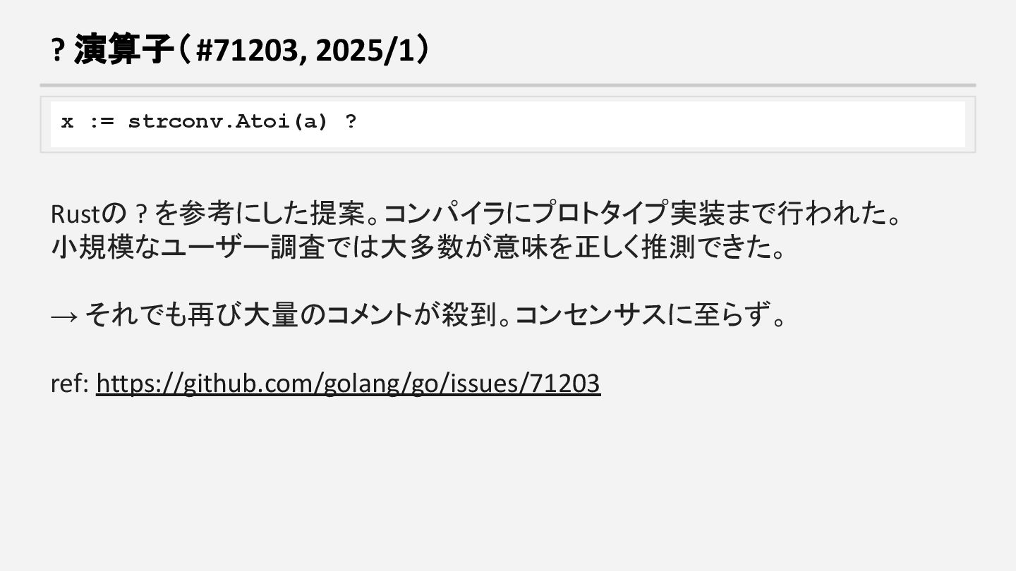 提案者 結果 2018 check / handle Marcel van Lohuizen 複雑すぎると判断 2019 try() 組み込み関数 Robert Griesemer 900超のコメント、断念 2024 ? 演算子 Ian Lance Taylor プロトタイプ実装まで行う も断念 ref: https://go.dev/blog/error-syntax