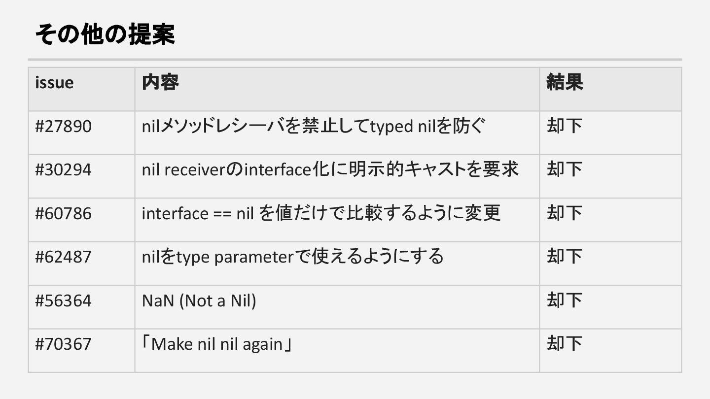 receiverのinterface化に明示的キャストを要求 却下 #60786 interface == nil を値だけで比較するように変更 却下 #62487 nilをtype parameterで使えるようにする 却下 #56364 NaN (Not a Nil) 却下 #70367 「Make nil nil again」 却下