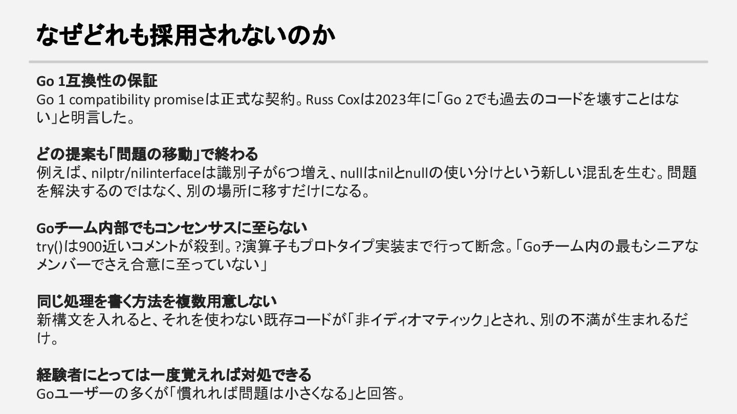 どの提案も「問題の移動」で終わる 例えば、nilptr/nilinterfaceは識別子が6つ増え、nullはnilとnullの使い分けという新しい混乱を生む。問題 を解決するのではなく、別の場所に移すだけになる。 Goチーム内部でもコンセンサスに至らない try()は900近いコメントが殺到。?演算子もプロトタイプ実装まで行って断念。「Goチーム内の最もシニアな メンバーでさえ合意に至っていない」 同じ処理を書く方法を複数用意しない 新構文を入れると、それを使わない既存コードが「非イディオマティック」とされ、別の不満が生まれるだ け。 経験者にとっては一度覚えれば対処できる Goユーザーの多くが「慣れれば問題は小さくなる」と回答。