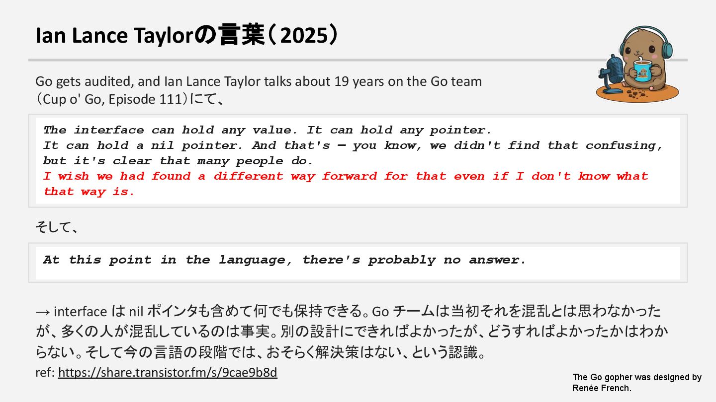 talks about 19 years on the Go team (Cup o' Go, Episode 111)にて、 The interface can hold any value. It can hold any pointer. It can hold a nil pointer. And that's — you know, we didn't find that confusing, but it's clear that many people do. I wish we had found a different way forward for that even if I don't know what that way is. そして、 At this point in the language, there's probably no answer. → interface は nil ポインタも含めて何でも保持できる。Go チームは当初それを混乱とは思わなかった が、多くの人が混乱しているのは事実。別の設計にできればよかったが、どうすればよかったかはわか らない。そして今の言語の段階では、おそらく解決策はない、という認識。 ref: https://share.transistor.fm/s/9cae9b8d The Go gopher was designed by Renée French.