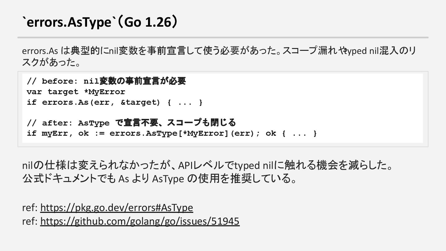 var target *MyError if errors.As(err, &target) { ... } // after: AsType で宣言不要、スコープも閉じる if myErr, ok := errors.AsType[*MyError](err); ok { ... } nilの仕様は変えられなかったが、APIレベルでtyped nilに触れる機会を減らした。 公式ドキュメントでも As より AsType の使用を推奨している。 ref: https://pkg.go.dev/errors#AsType ref: https://github.com/golang/go/issues/51945