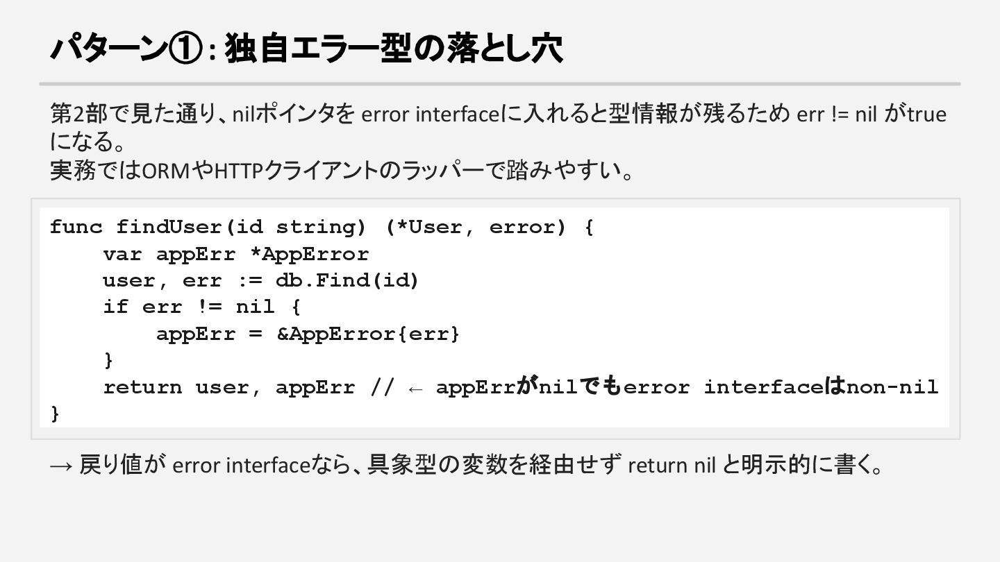 になる。 実務ではORMやHTTPクライアントのラッパーで踏みやすい。 func findUser(id string) (*User, error) { var appErr *AppError user, err := db.Find(id) if err != nil { appErr = &AppError{err} } return user, appErr // ← appErrがnilでもerror interfaceはnon-nil } → 戻り値が error interfaceなら、具象型の変数を経由せず return nil と明示的に書く。