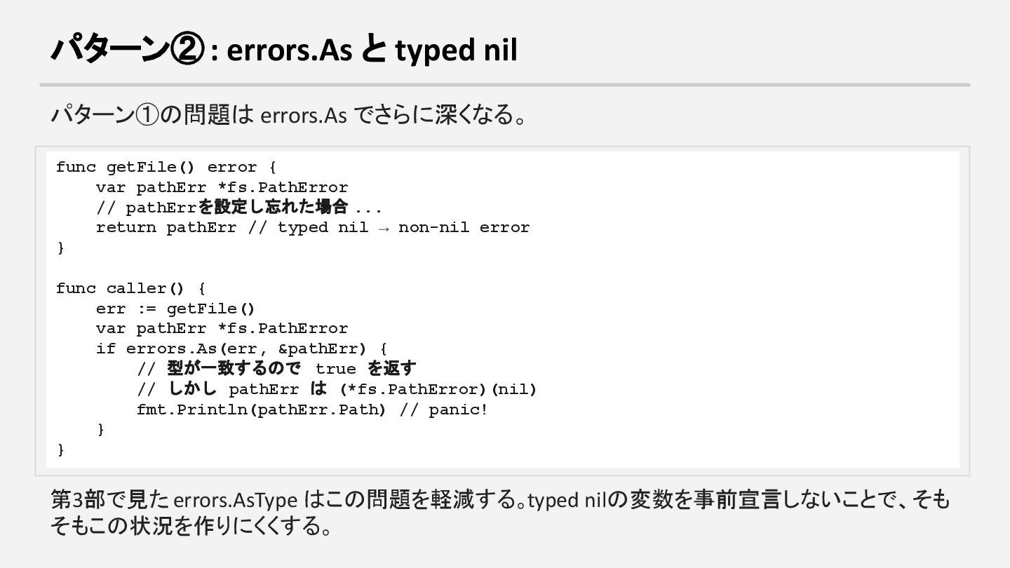 getFile() error { var pathErr *fs.PathError // pathErrを設定し忘れた場合 ... return pathErr // typed nil → non-nil error } func caller() { err := getFile() var pathErr *fs.PathError if errors.As(err, &pathErr) { // 型が一致するので true を返す // しかし pathErr は (*fs.PathError)(nil) fmt.Println(pathErr.Path) // panic! } } 第3部で見た errors.AsType はこの問題を軽減する。typed nilの変数を事前宣言しないことで、そも そもこの状況を作りにくくする。
