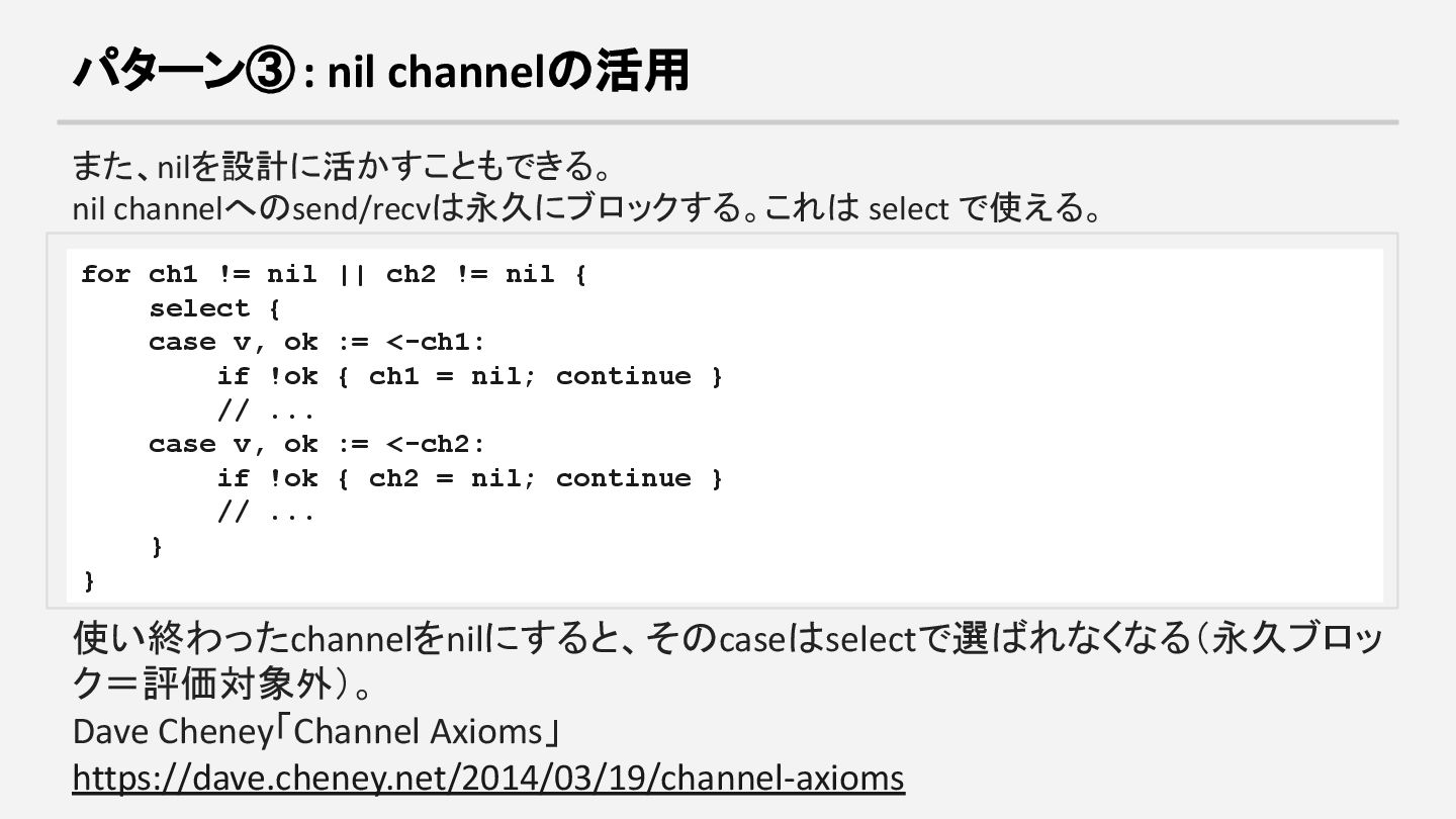 ch1 != nil || ch2 != nil { select { case v, ok := <-ch1: if !ok { ch1 = nil; continue } // ... case v, ok := <-ch2: if !ok { ch2 = nil; continue } // ... } } 使い終わったchannelをnilにすると、そのcaseはselectで選ばれなくなる(永久ブロッ ク=評価対象外)。 Dave Cheney「Channel Axioms」 https://dave.cheney.net/2014/03/19/channel-axioms