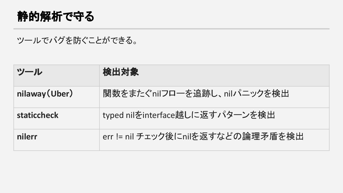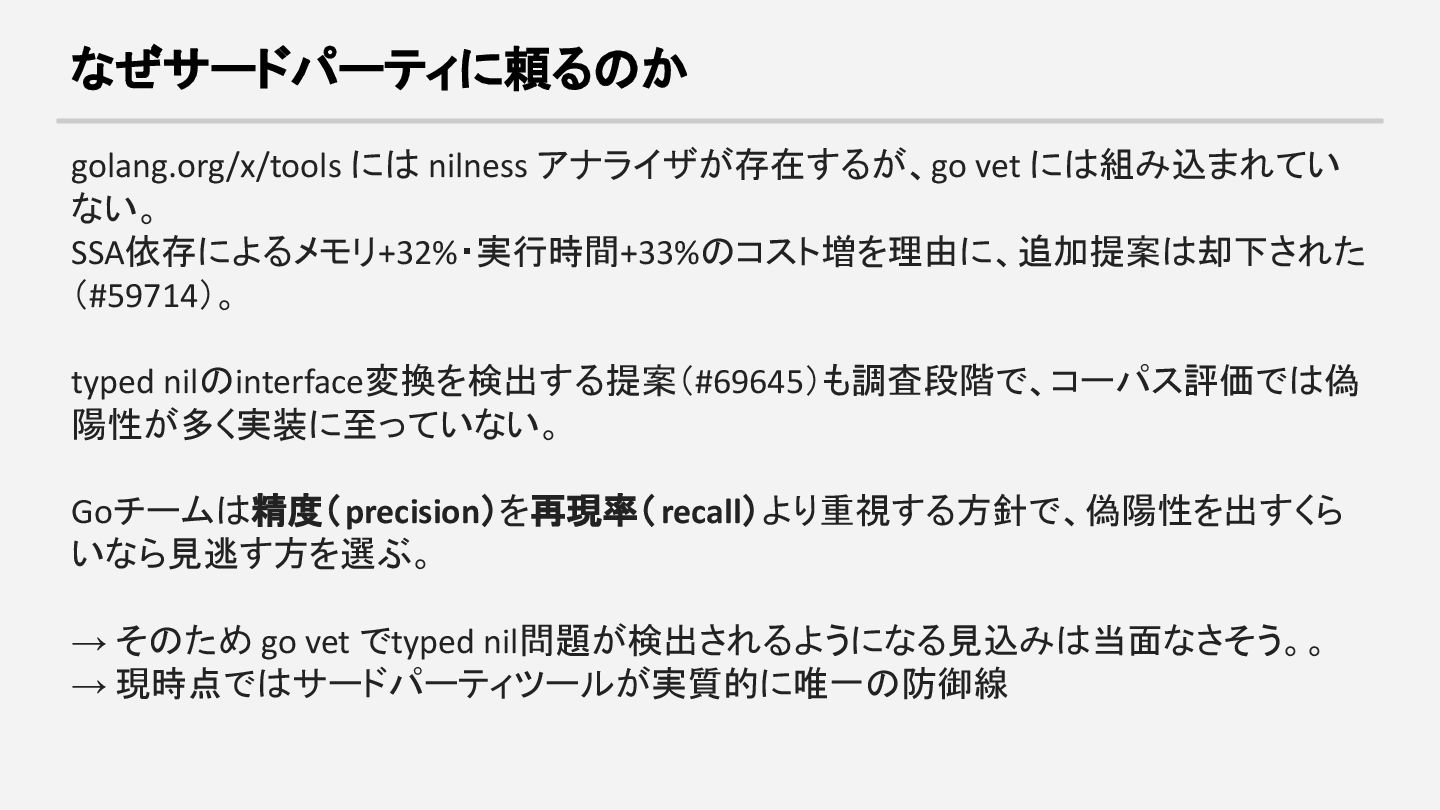 typed nilのinterface変換を検出する提案(#69645)も調査段階で、コーパス評価では偽 陽性が多く実装に至っていない。 Goチームは精度(precision)を再現率(recall)より重視する方針で、偽陽性を出すくら いなら見逃す方を選ぶ。 → そのため go vet でtyped nil問題が検出されるようになる見込みは当面なさそう。。 → 現時点ではサードパーティツールが実質的に唯一の防御線