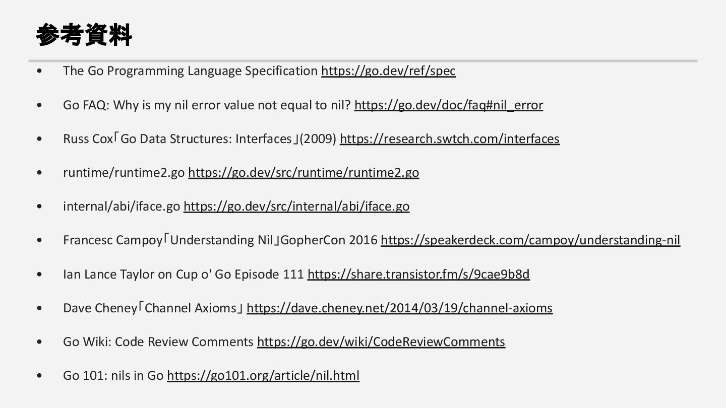 FAQ: Why is my nil error value not equal to nil? https://go.dev/doc/faq#nil_error • Russ Cox「Go Data Structures: Interfaces」(2009) https://research.swtch.com/interfaces • runtime/runtime2.go https://go.dev/src/runtime/runtime2.go • internal/abi/iface.go https://go.dev/src/internal/abi/iface.go • Francesc Campoy「Understanding Nil」GopherCon 2016 https://speakerdeck.com/campoy/understanding-nil • Ian Lance Taylor on Cup o' Go Episode 111 https://share.transistor.fm/s/9cae9b8d • Dave Cheney「Channel Axioms」 https://dave.cheney.net/2014/03/19/channel-axioms • Go Wiki: Code Review Comments https://go.dev/wiki/CodeReviewComments • Go 101: nils in Go https://go101.org/article/nil.html