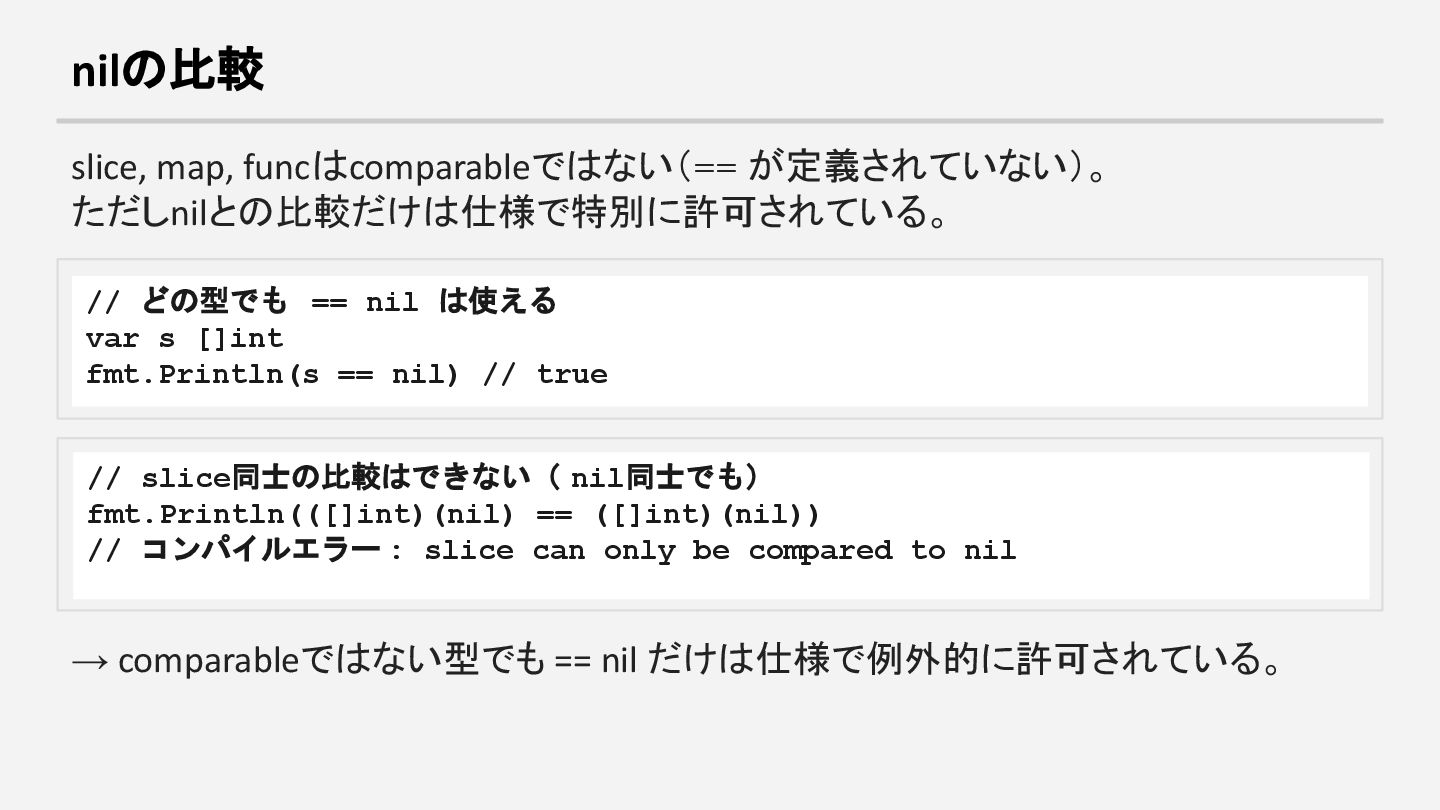 は使える var s []int fmt.Println(s == nil) // true // slice同士の比較はできない( nil同士でも) fmt.Println(([]int)(nil) == ([]int)(nil)) // コンパイルエラー : slice can only be compared to nil → comparableではない型でも == nil だけは仕様で例外的に許可されている。