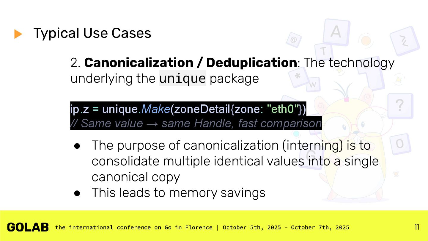 underlying the unique package ip.z = unique.Make(zoneDetail{zone: "eth0"}) // Same value → same Handle, fast comparison • The purpose of canonicalization (interning) is to consolidate multiple identical values into a single canonical copy • This leads to memory savings