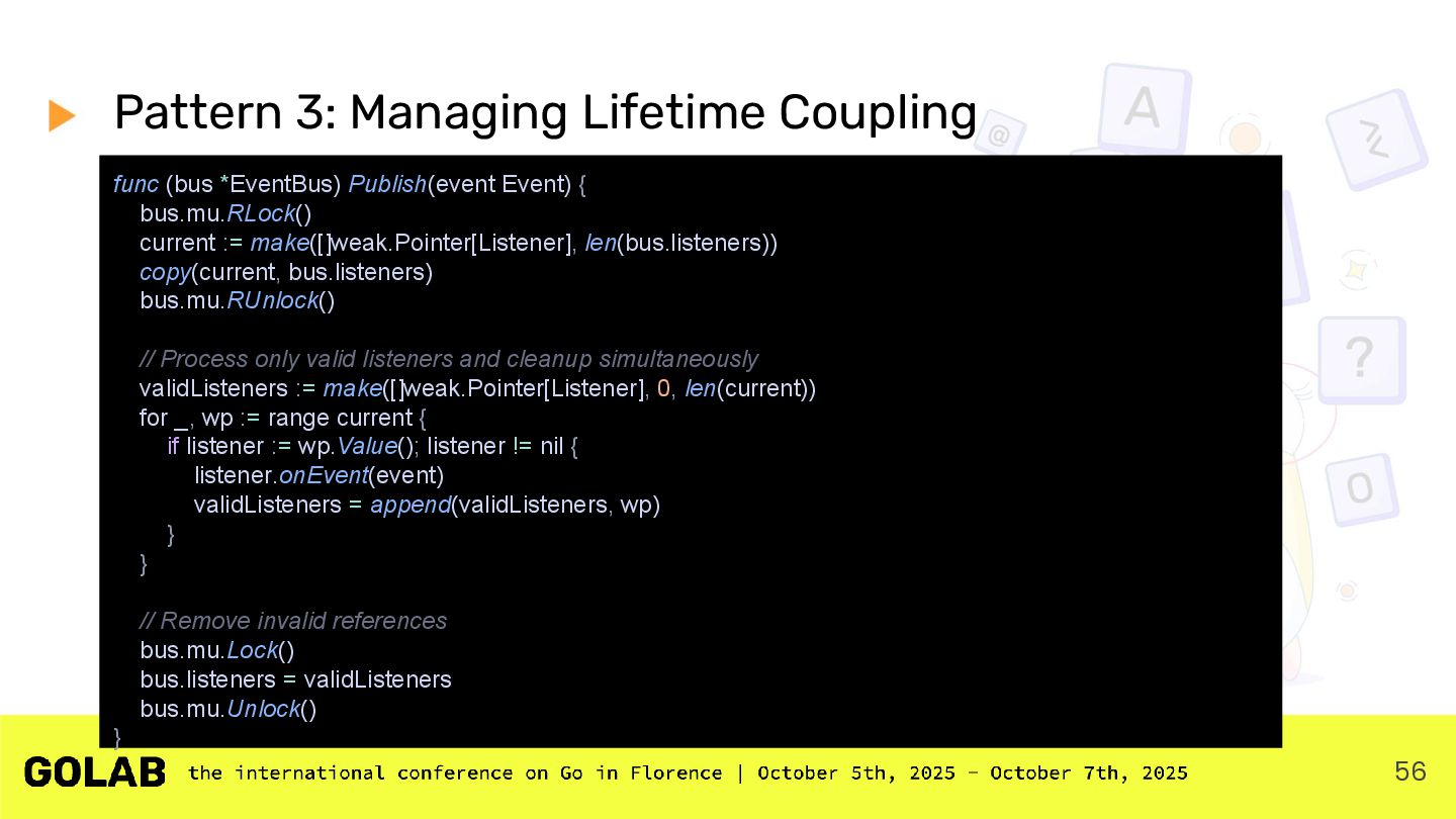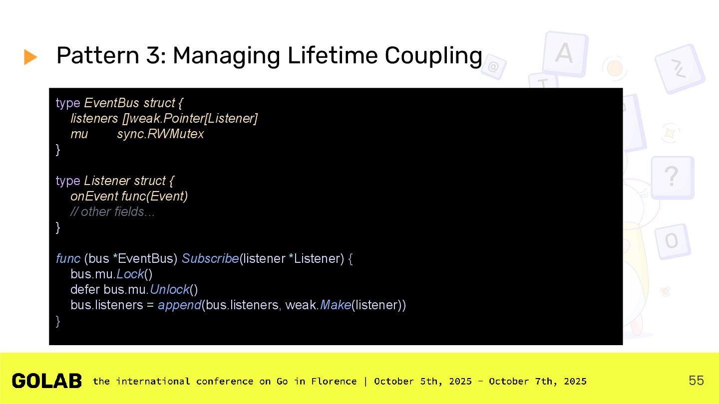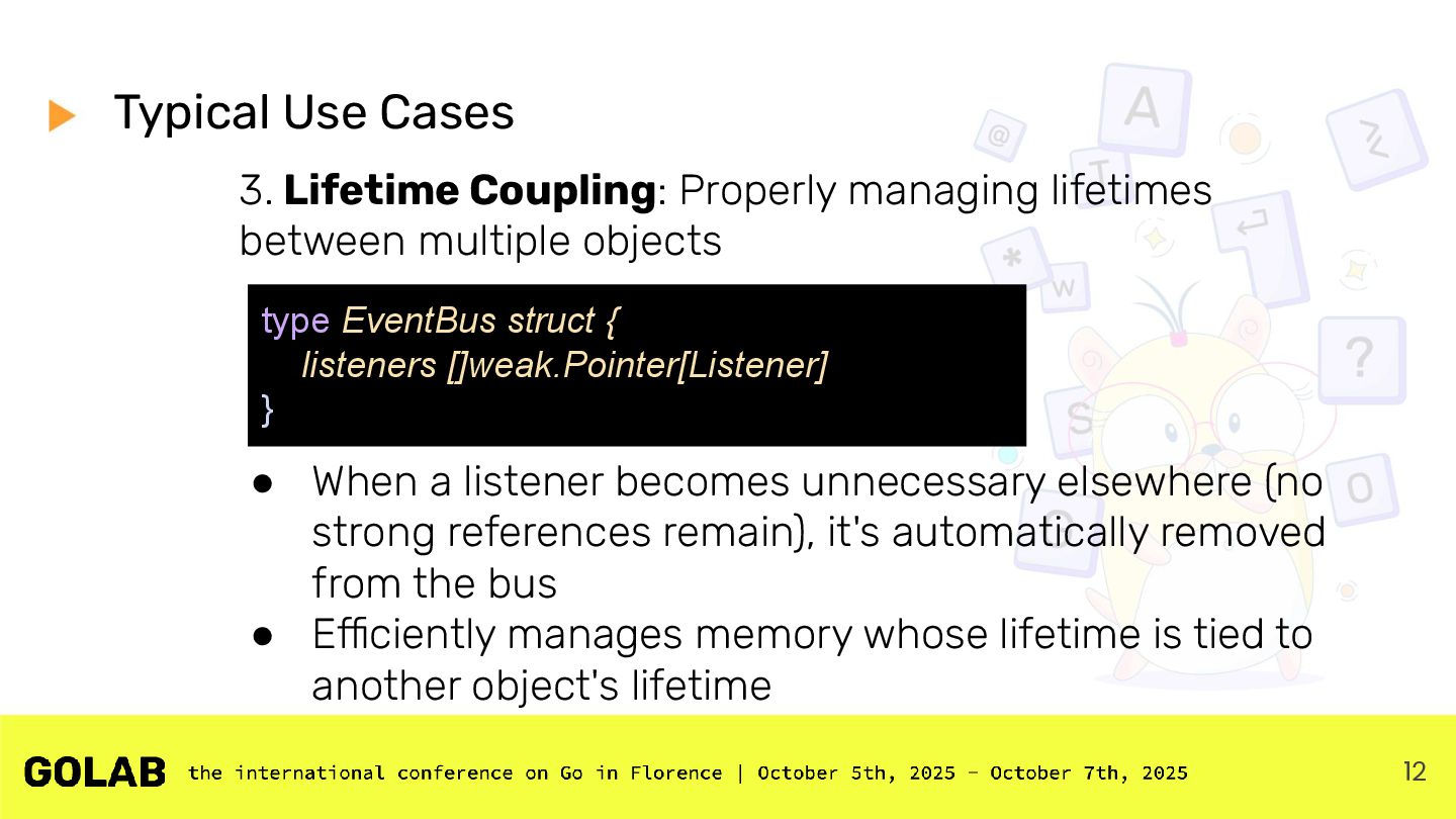 between multiple objects • When a listener becomes unnecessary elsewhere (no strong references remain), it's automatically removed from the bus • Efficiently manages memory whose lifetime is tied to another object's lifetime type EventBus struct { listeners []weak.Pointer[Listener] }