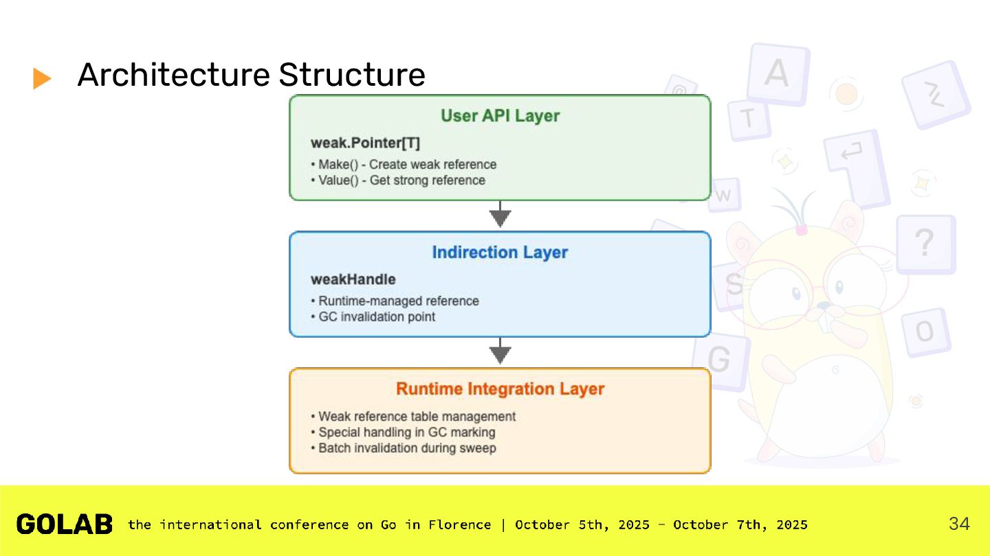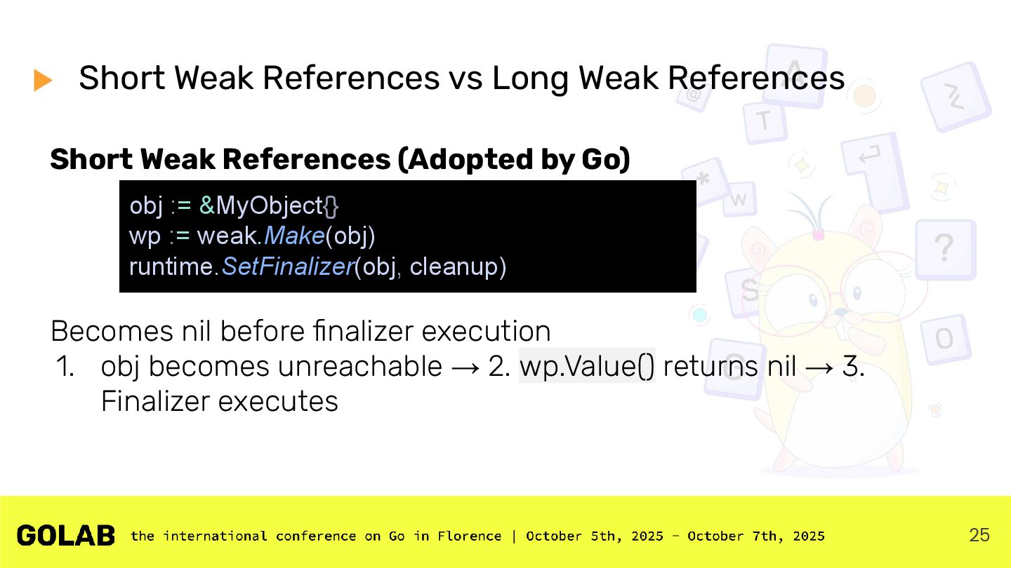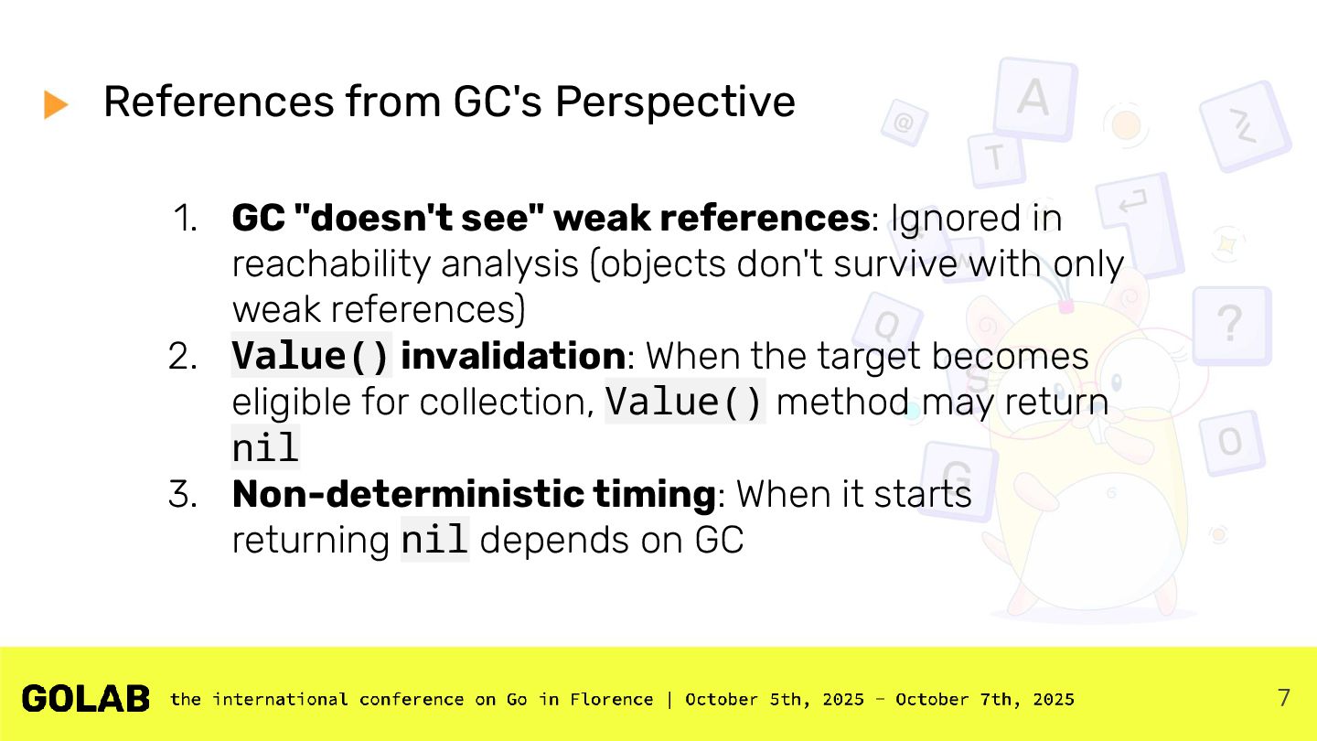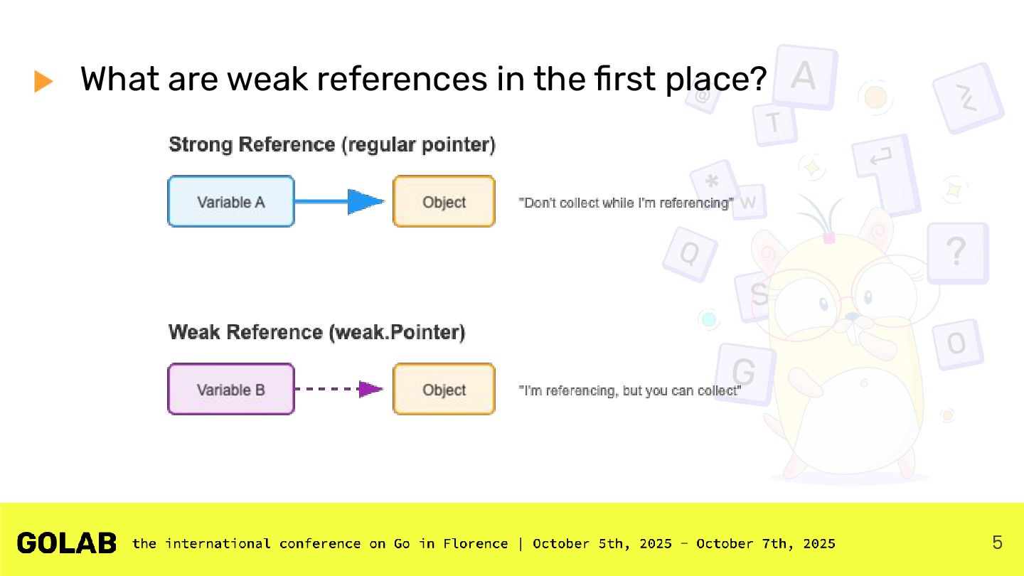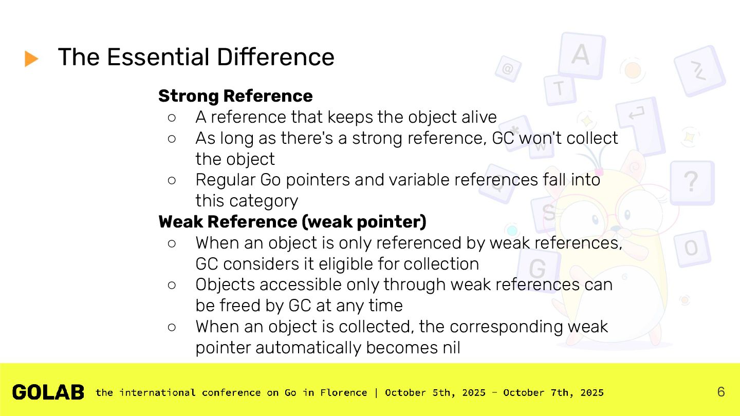 keeps the object alive ◦ As long as there's a strong reference, GC won't collect the object ◦ Regular Go pointers and variable references fall into this category Weak Reference (weak pointer) ◦ When an object is only referenced by weak references, GC considers it eligible for collection ◦ Objects accessible only through weak references can be freed by GC at any time ◦ When an object is collected, the corresponding weak pointer automatically becomes nil