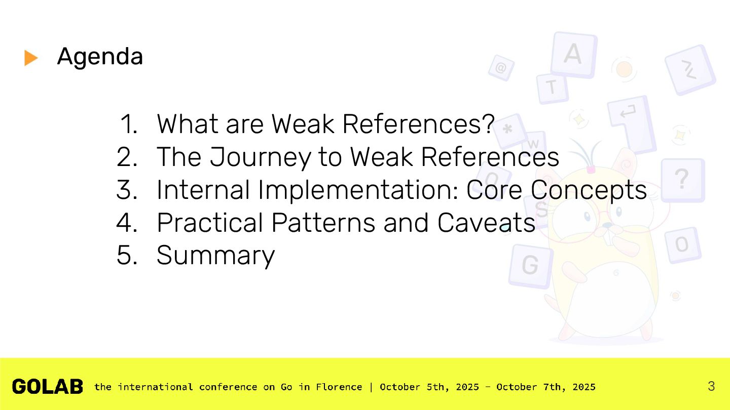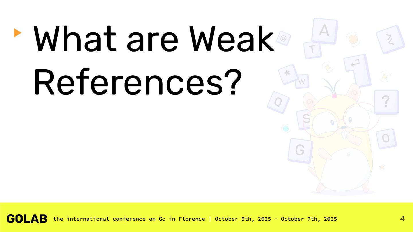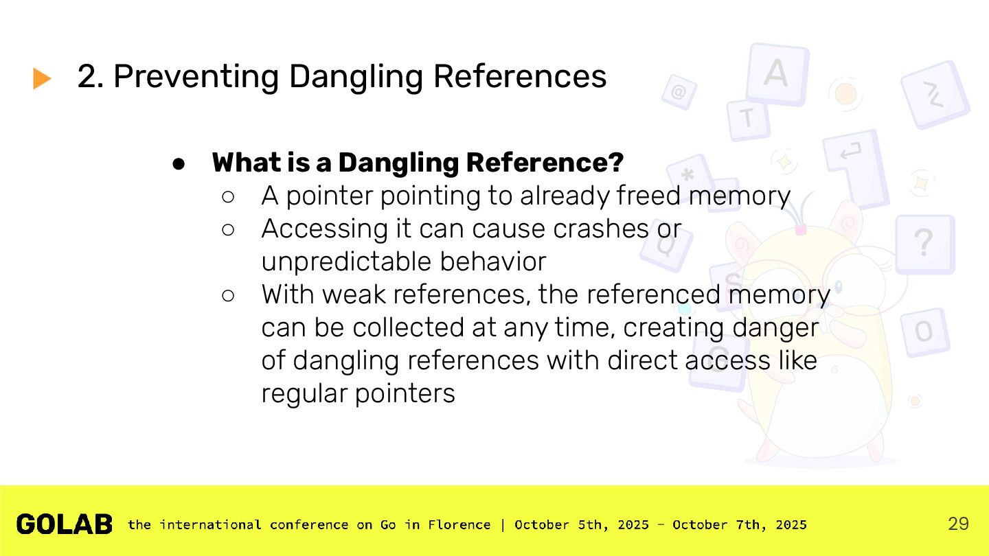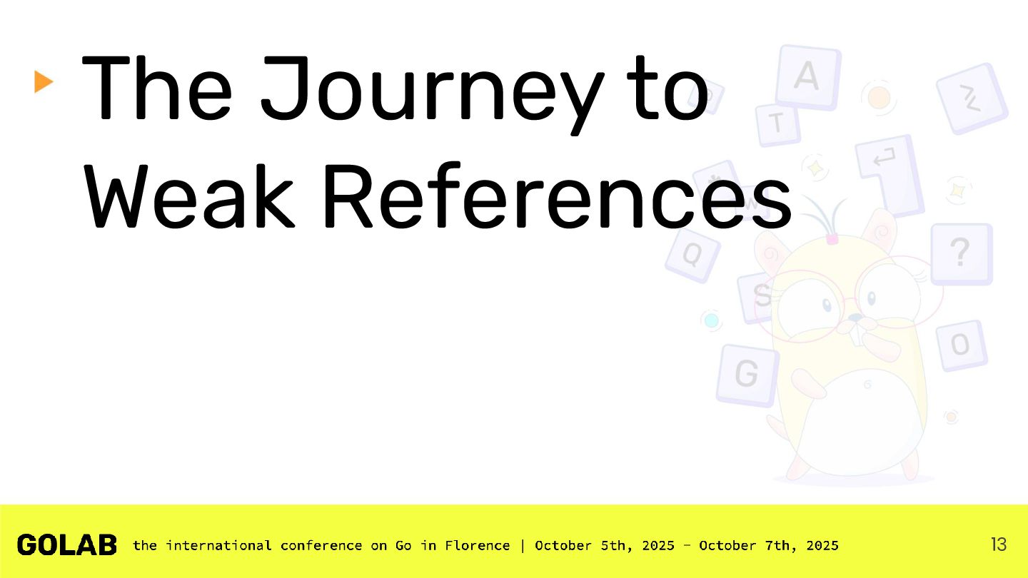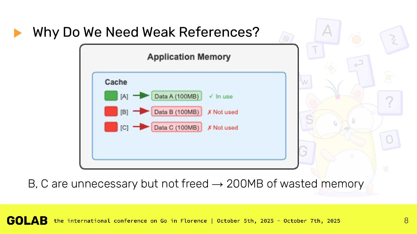 keeps the object alive ◦ As long as there's a strong reference, GC won't collect the object ◦ Regular Go pointers and variable references fall into this category Weak Reference (weak pointer) ◦ When an object is only referenced by weak references, GC considers it eligible for collection ◦ Objects accessible only through weak references can be freed by GC at any time ◦ When an object is collected, the corresponding weak pointer automatically becomes nil