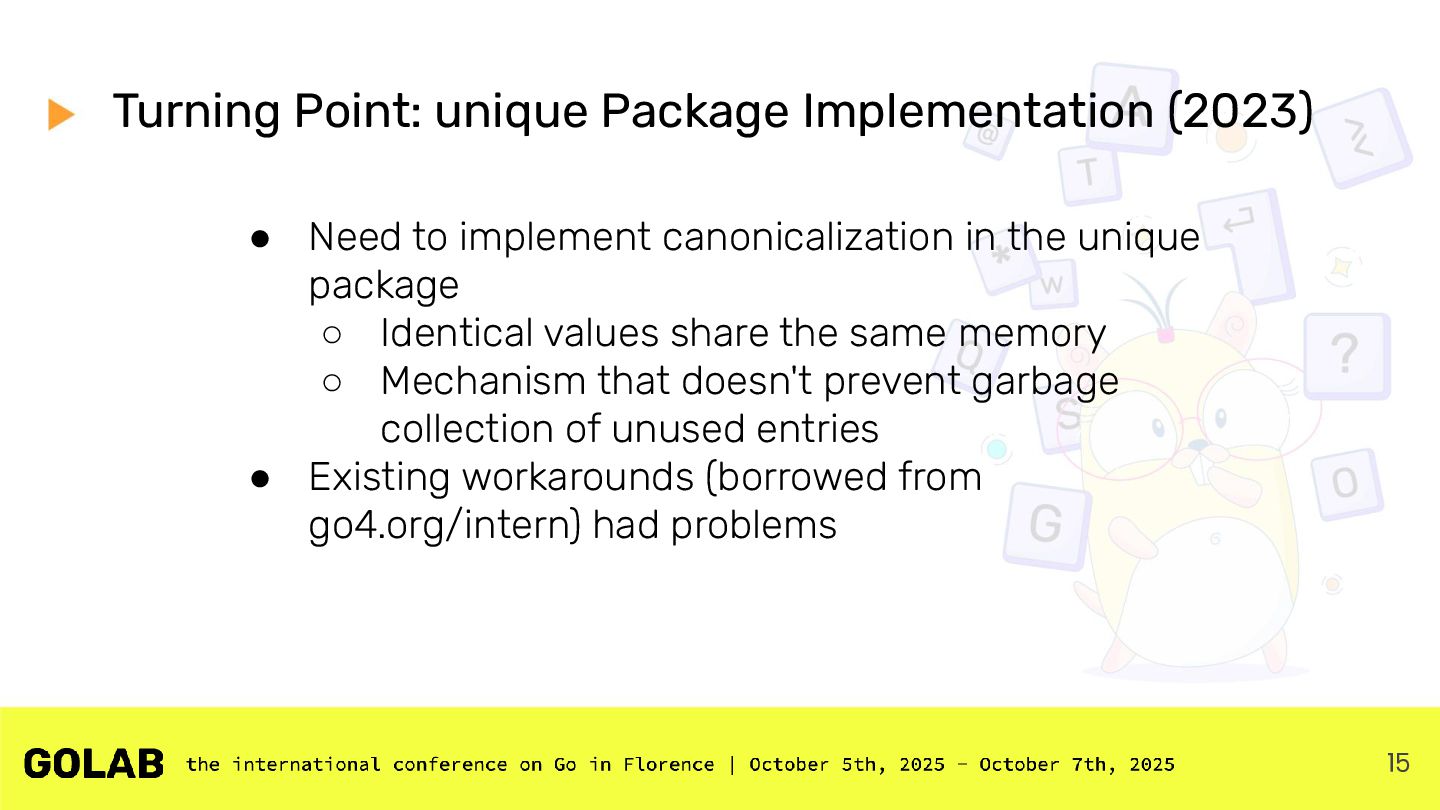 implement canonicalization in the unique package ◦ Identical values share the same memory ◦ Mechanism that doesn't prevent garbage collection of unused entries • Existing workarounds (borrowed from go4.org/intern) had problems