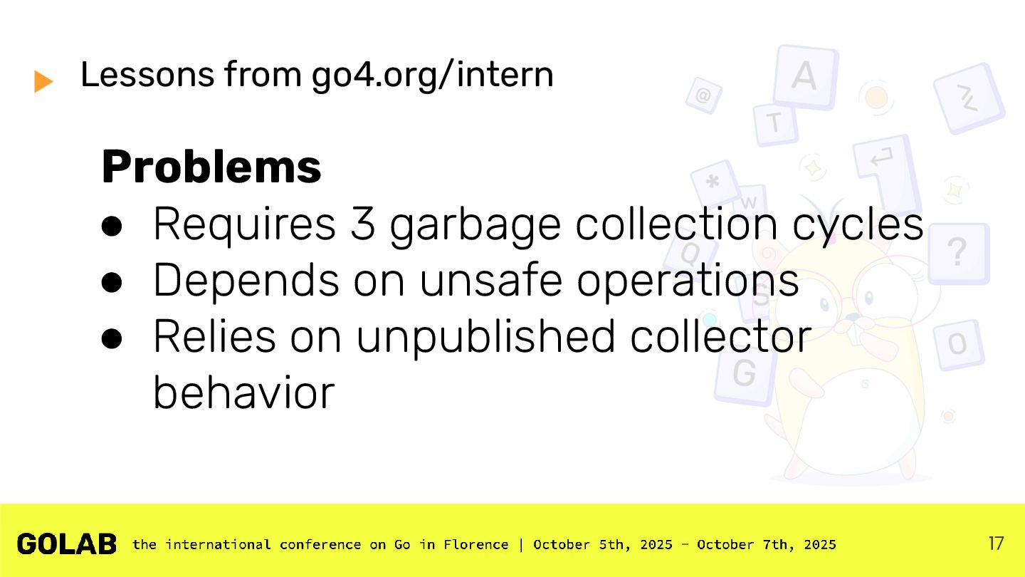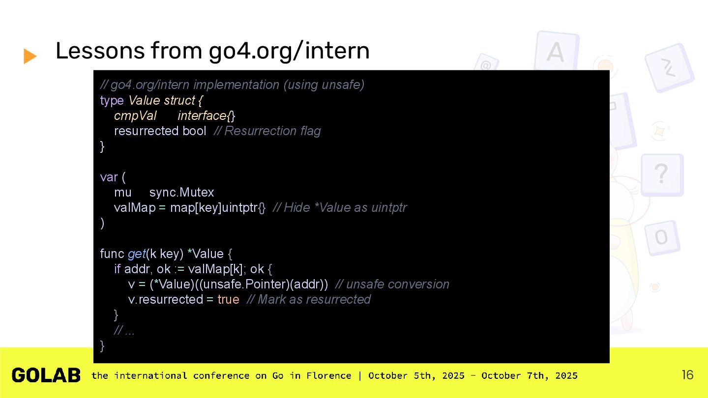 • Depends on unsafe operations • Relies on unpublished collector behavior // go4.org/intern implementation (using unsafe) type Value struct { cmpVal interface{} resurrected bool // Resurrection flag } var ( mu sync.Mutex valMap = map[key]uintptr{} // Hide *Value as uintptr ) func get(k key) *Value { if addr, ok := valMap[k]; ok { v = (*Value)((unsafe.Pointer)(addr)) // unsafe conversion v.resurrected = true // Mark as resurrected } // ... }
