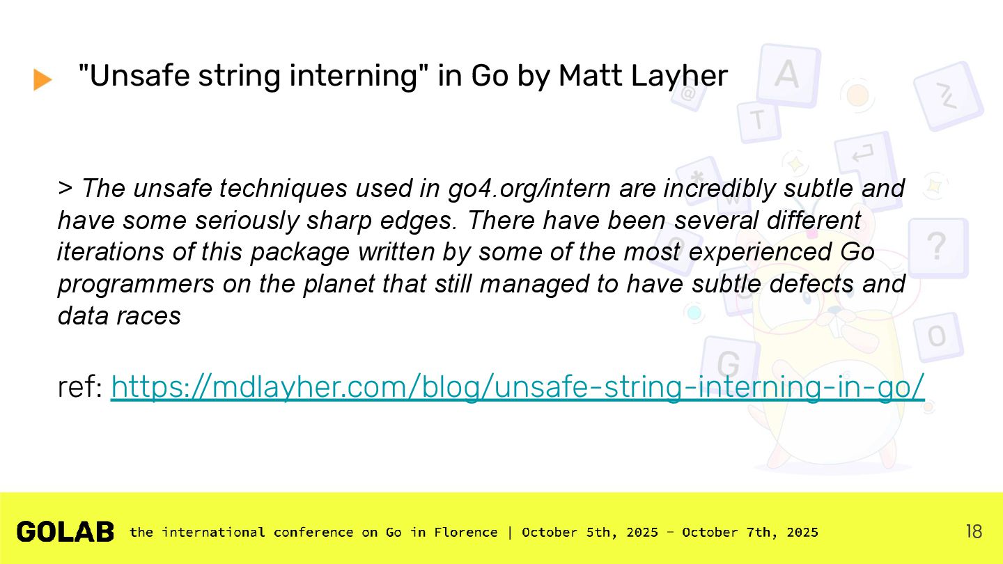 13. 18 "Unsafe string interning" in Go by Matt Layher >
