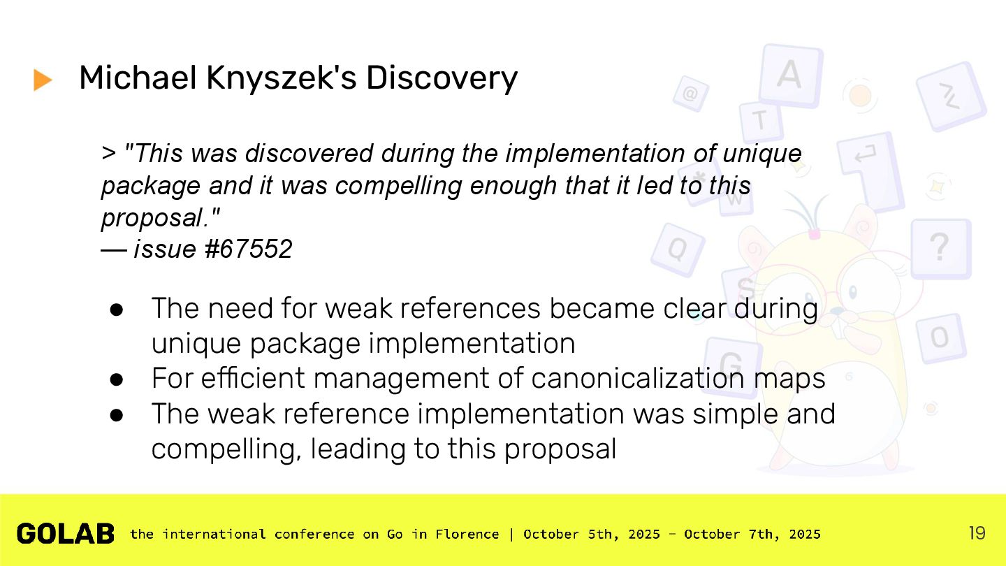 implementation of unique package and it was compelling enough that it led to this proposal." — issue #67552 • The need for weak references became clear during unique package implementation • For efficient management of canonicalization maps • The weak reference implementation was simple and compelling, leading to this proposal