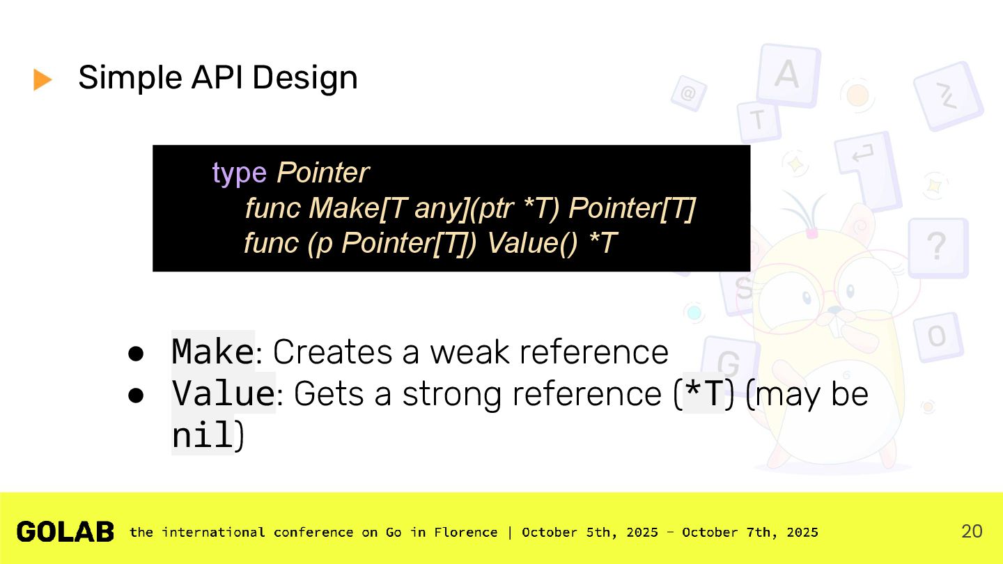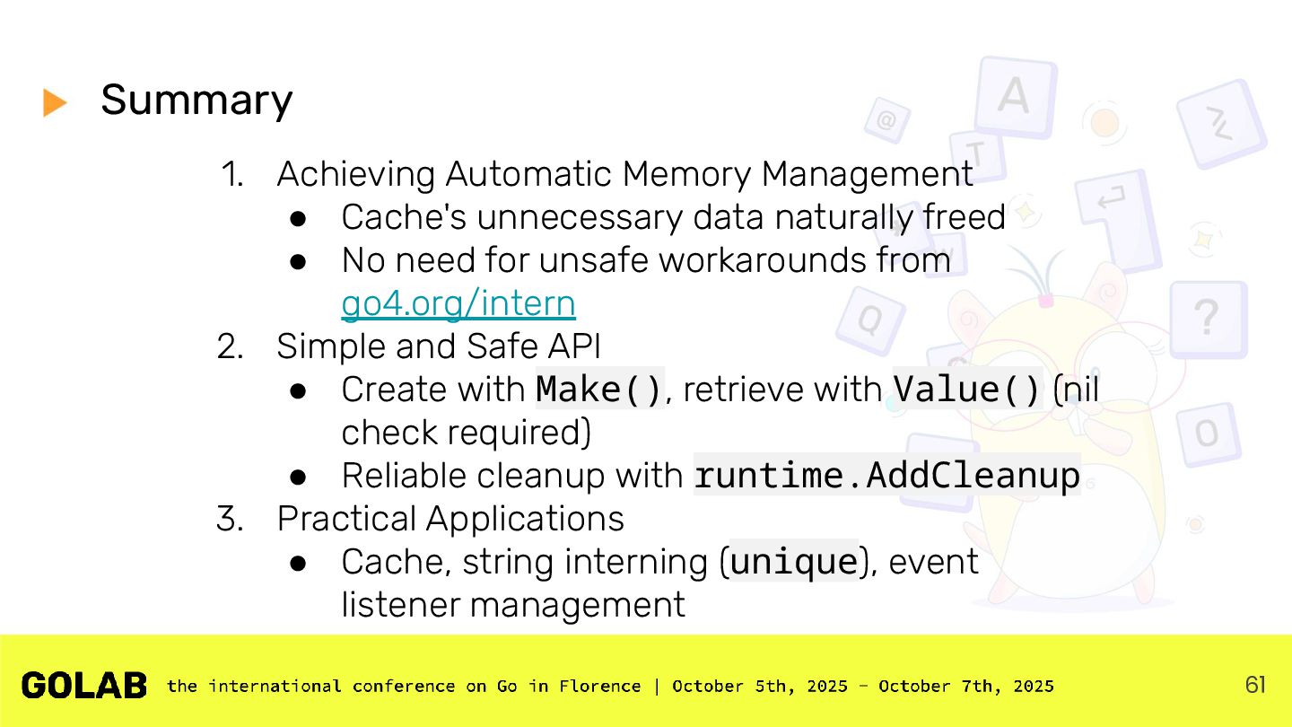 data naturally freed • No need for unsafe workarounds from go4.org/intern 2. Simple and Safe API • Create with Make(), retrieve with Value() (nil check required) • Reliable cleanup with runtime.AddCleanup