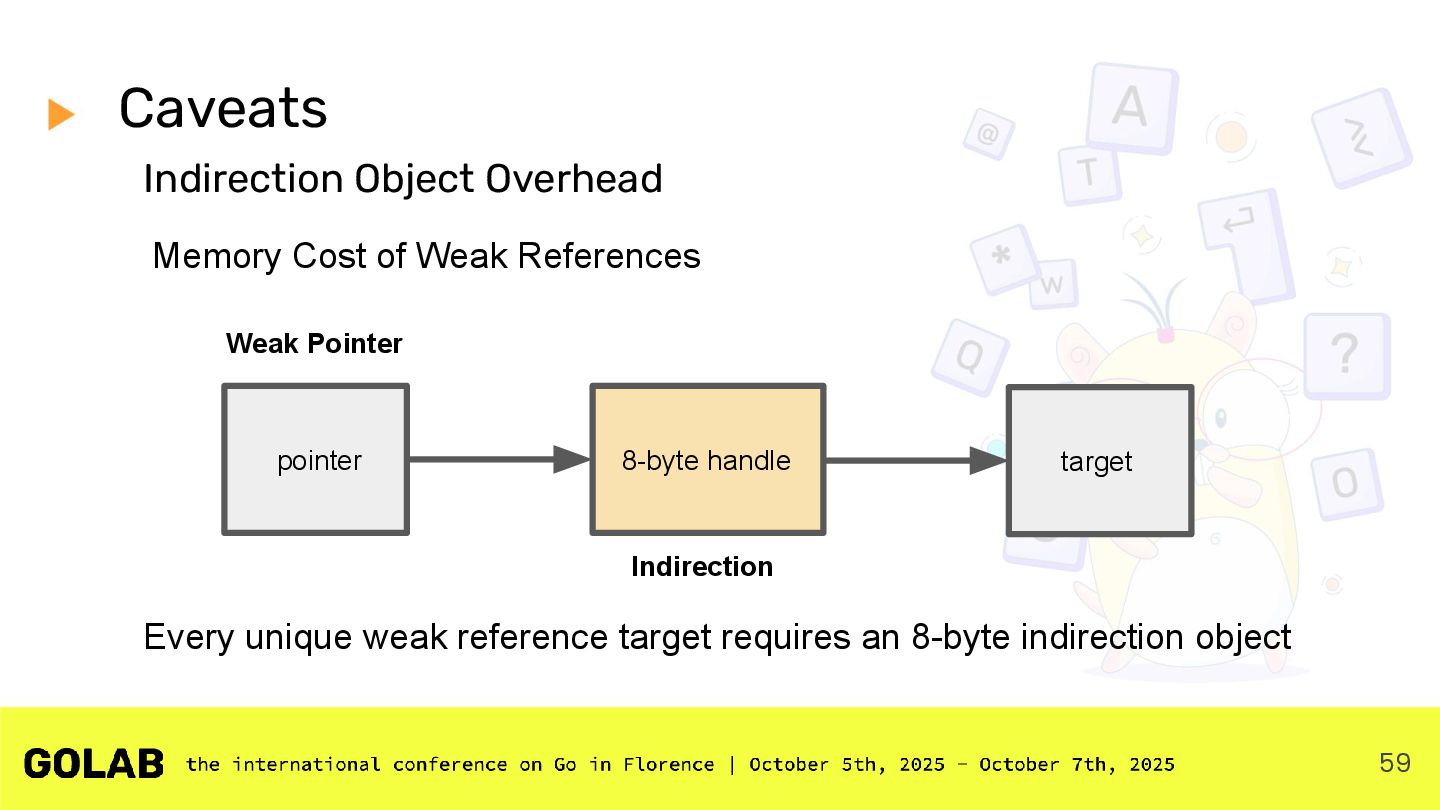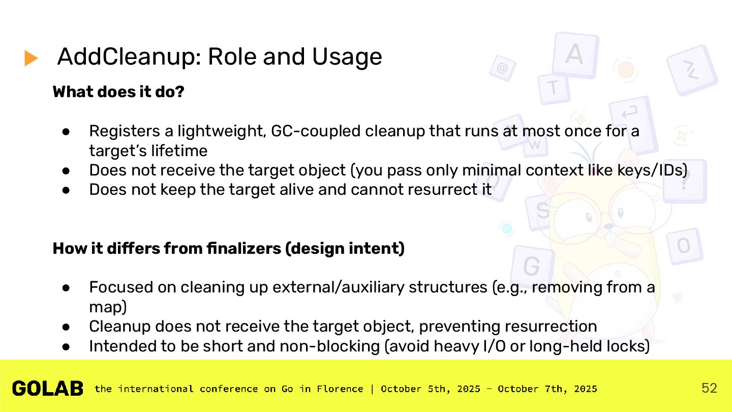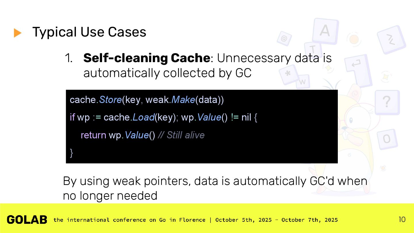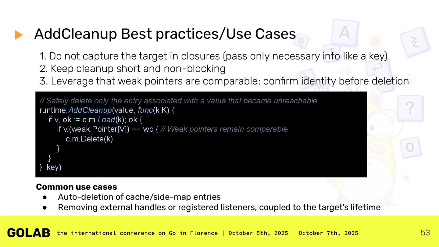 target in closures (pass only necessary info like a key) 2. Keep cleanup short and non-blocking 3. Leverage that weak pointers are comparable; confirm identity before deletion // Safely delete only the entry associated with a value that became unreachable runtime.AddCleanup(value, func(k K) { if v, ok := c.m.Load(k); ok { if v.(weak.Pointer[V]) == wp { // Weak pointers remain comparable c.m.Delete(k) } } }, key) Common use cases • Auto-deletion of cache/side-map entries • Removing external handles or registered listeners, coupled to the target's lifetime