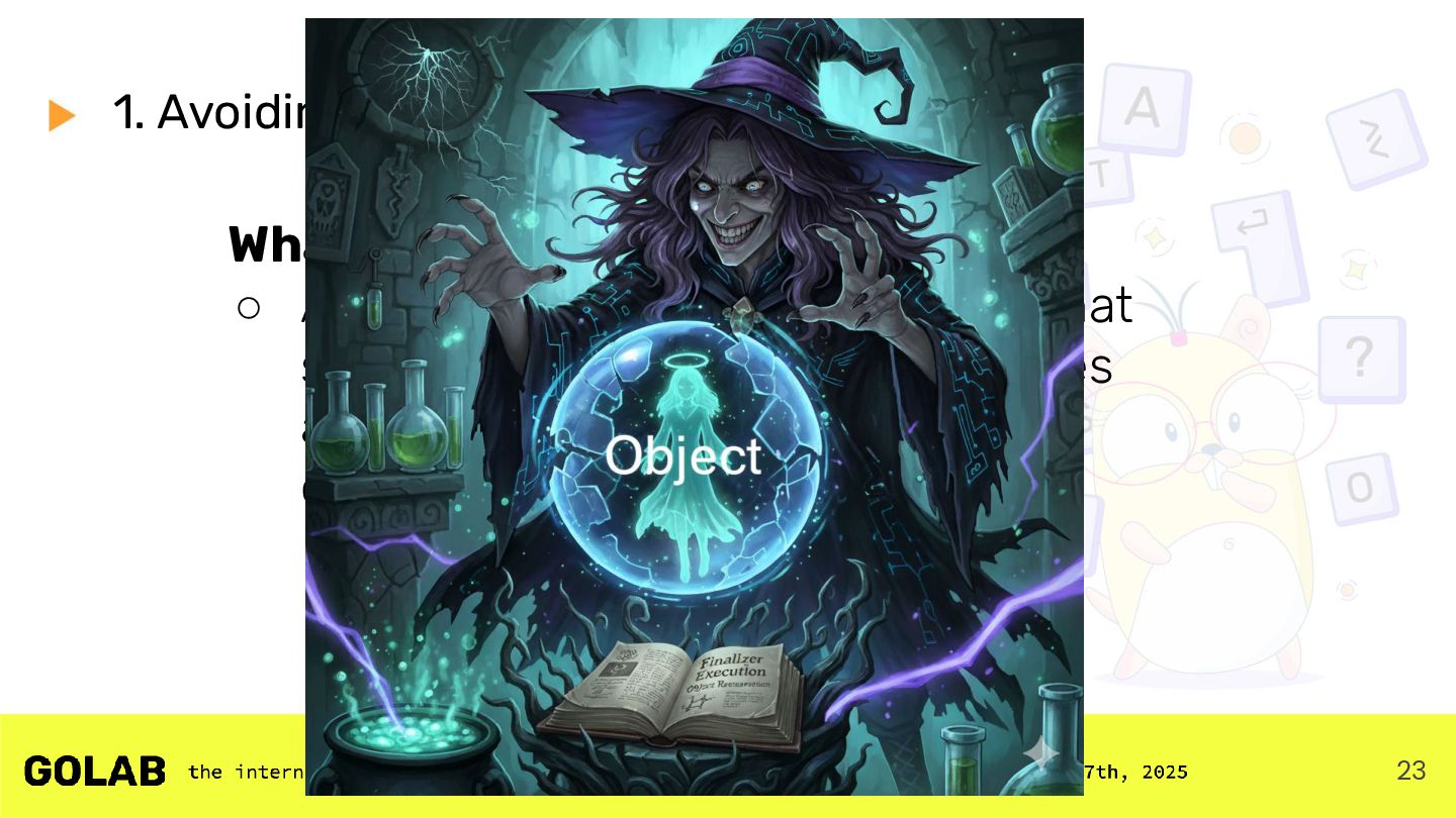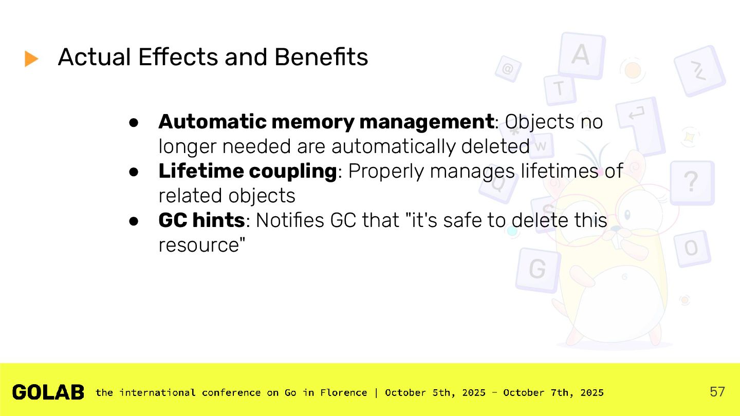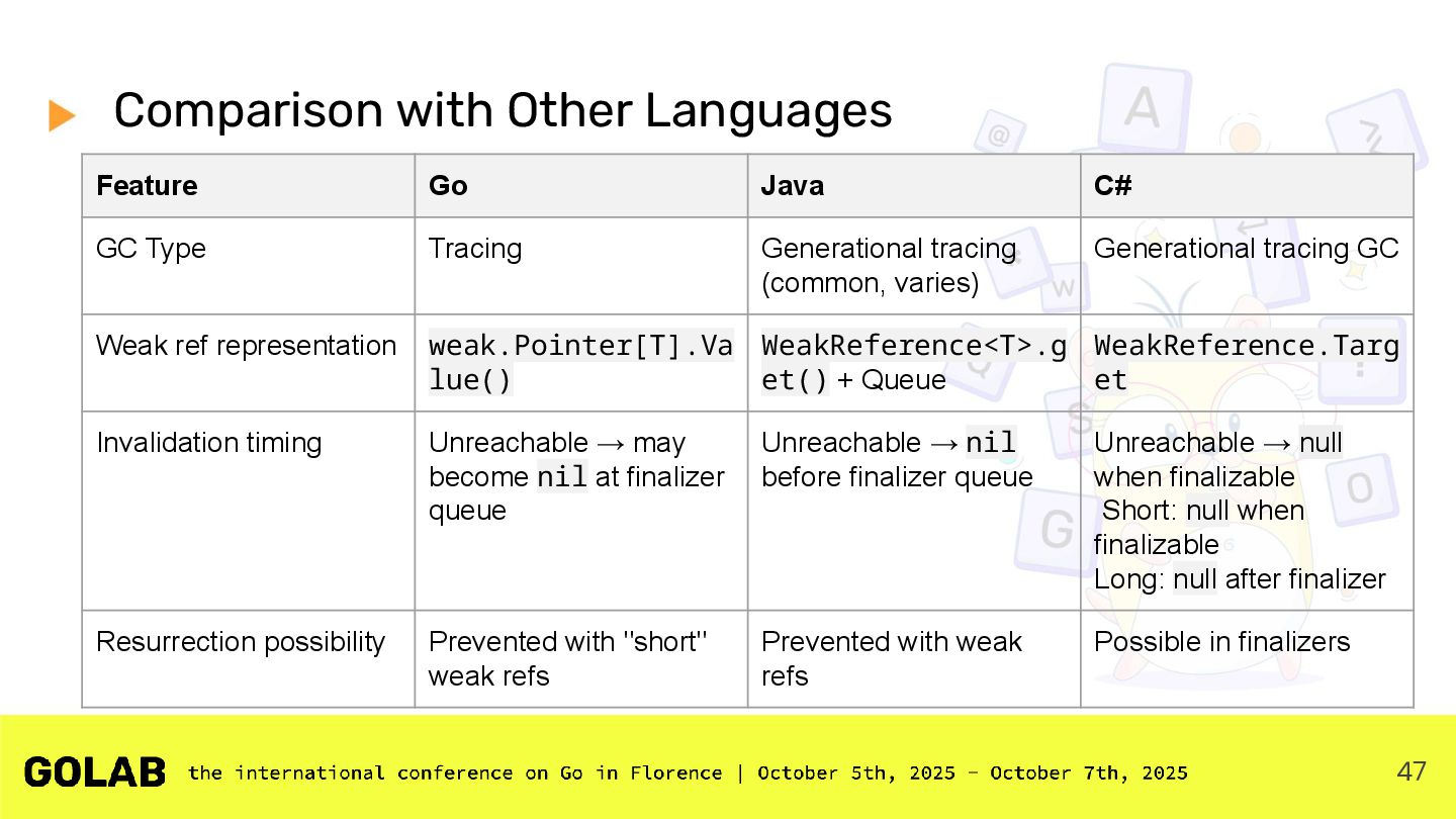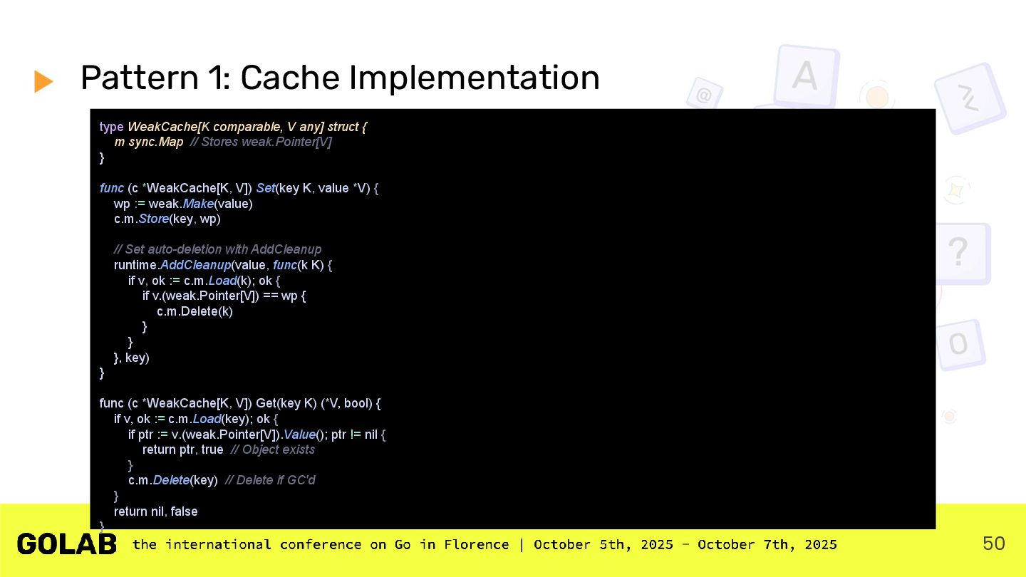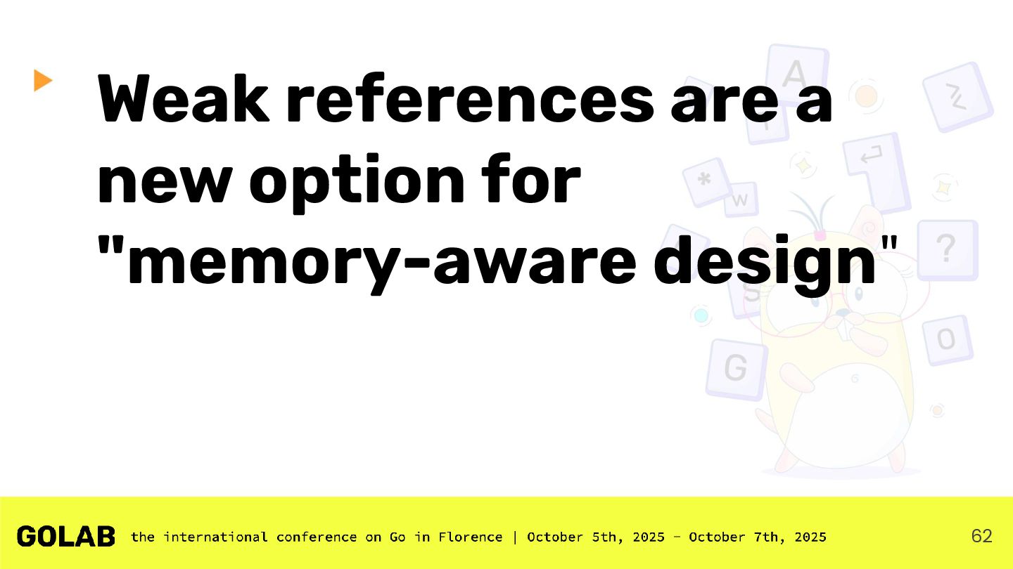 target in closures (pass only necessary info like a key) 2. Keep cleanup short and non-blocking 3. Leverage that weak pointers are comparable; confirm identity before deletion // Safely delete only the entry associated with a value that became unreachable runtime.AddCleanup(value, func(k K) { if v, ok := c.m.Load(k); ok { if v.(weak.Pointer[V]) == wp { // Weak pointers remain comparable c.m.Delete(k) } } }, key) Common use cases • Auto-deletion of cache/side-map entries • Removing external handles or registered listeners, coupled to the target's lifetime