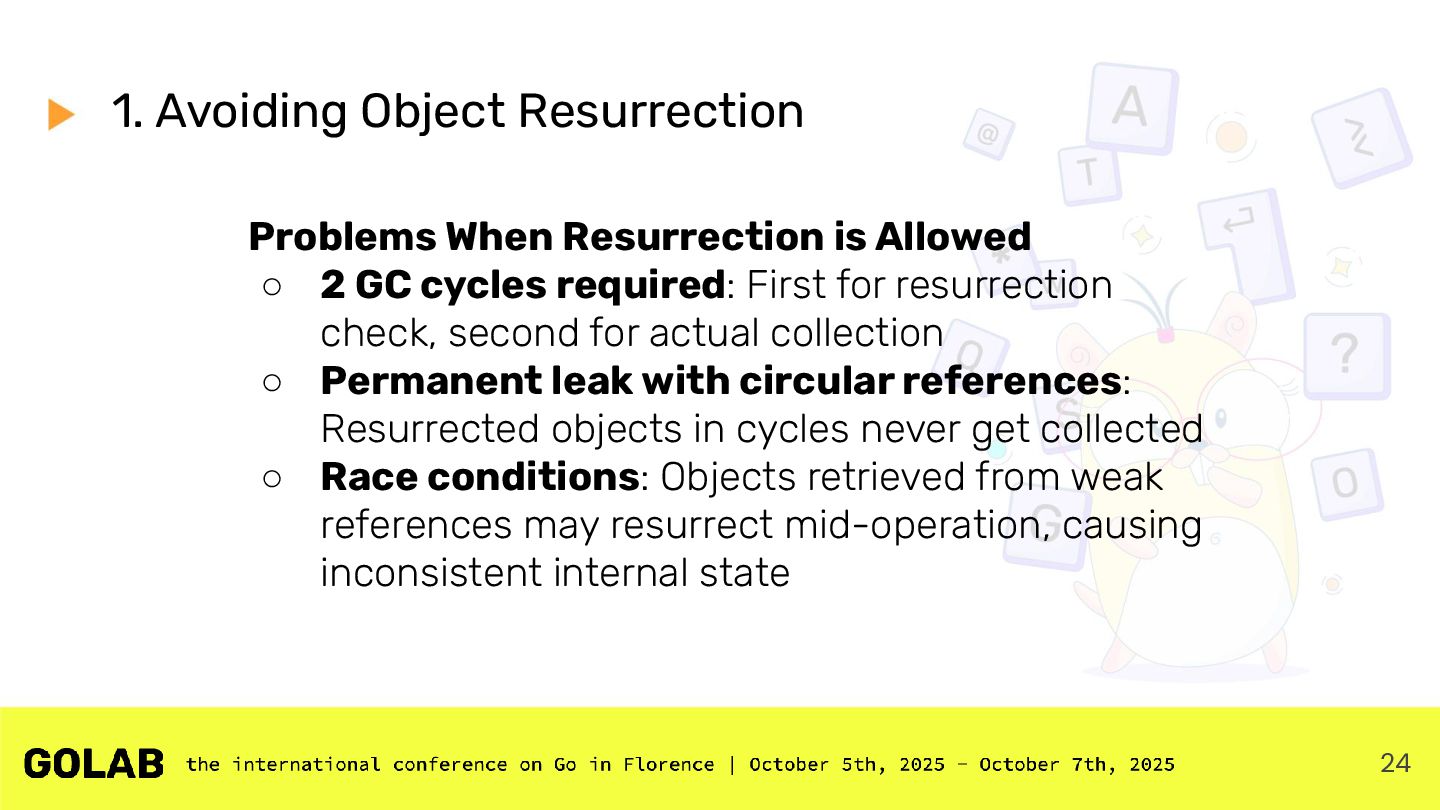 ◦ 2 GC cycles required: First for resurrection check, second for actual collection ◦ Permanent leak with circular references: Resurrected objects in cycles never get collected ◦ Race conditions: Objects retrieved from weak references may resurrect mid-operation, causing inconsistent internal state