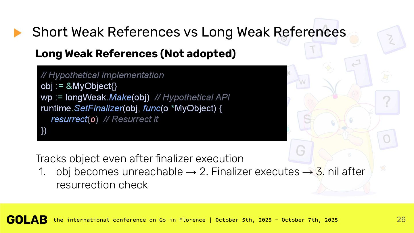 References (Not adopted) Tracks object even after finalizer execution 1. obj becomes unreachable → 2. Finalizer executes → 3. nil after resurrection check // Hypothetical implementation obj := &MyObject{} wp := longWeak.Make(obj) // Hypothetical API runtime.SetFinalizer(obj, func(o *MyObject) { resurrect(o) // Resurrect it })