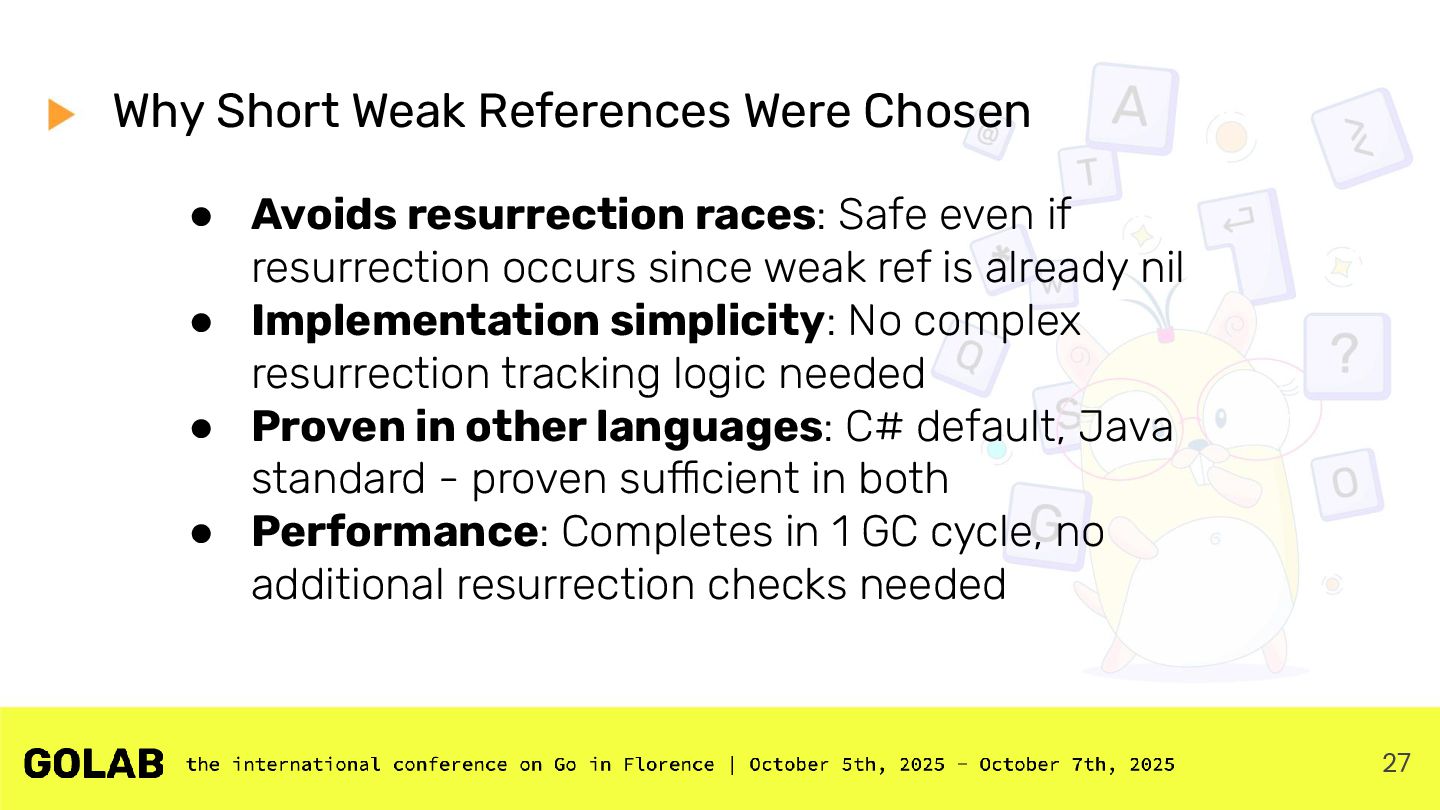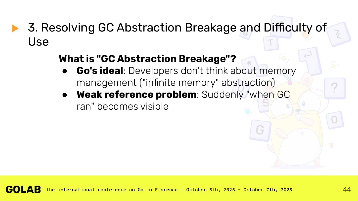 What is "GC Abstraction Breakage"? • Go's ideal: Developers don't think about memory management ("infinite memory" abstraction) • Weak reference problem: Suddenly "when GC ran" becomes visible