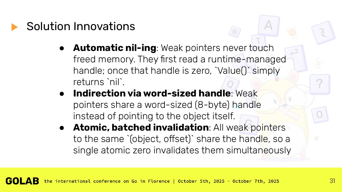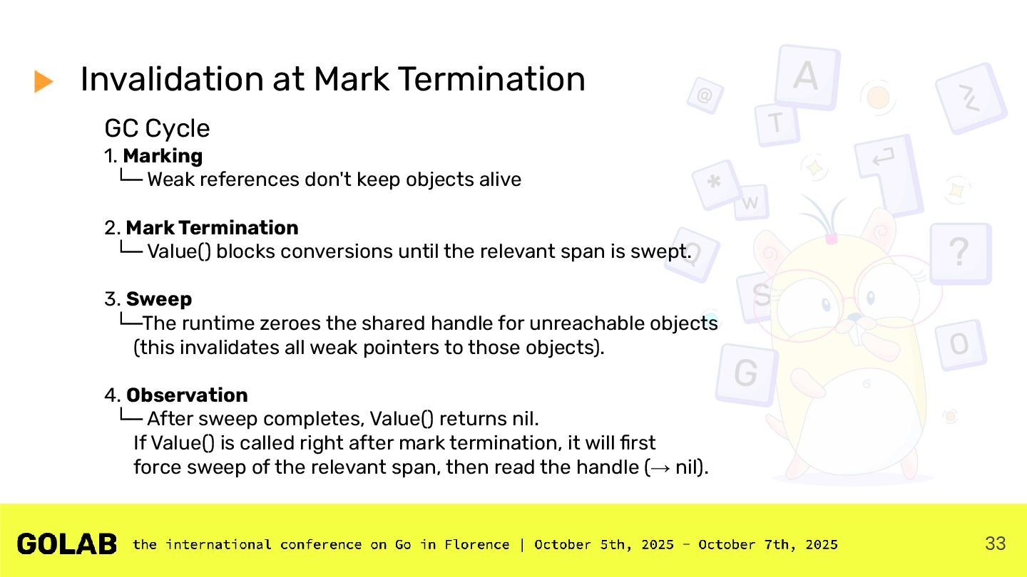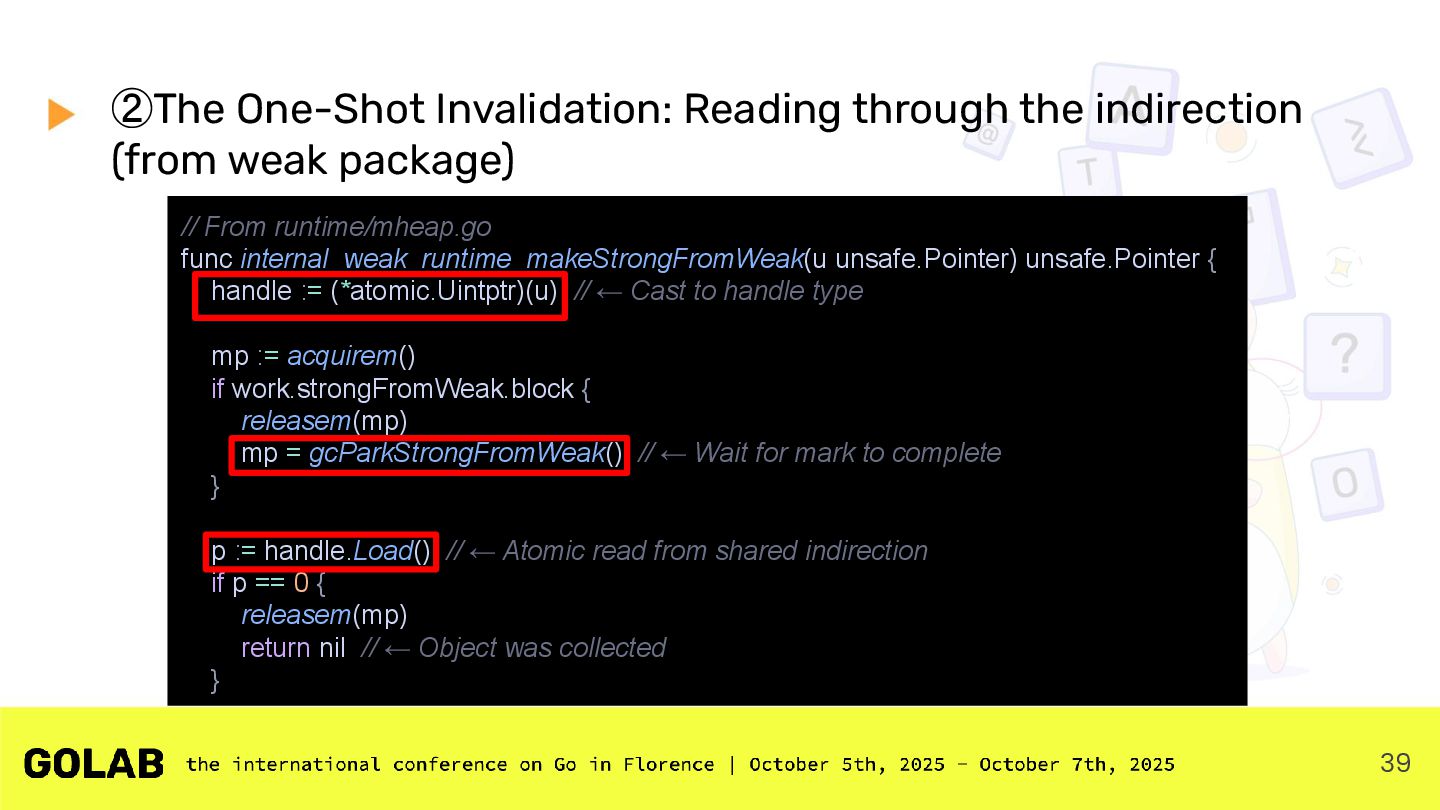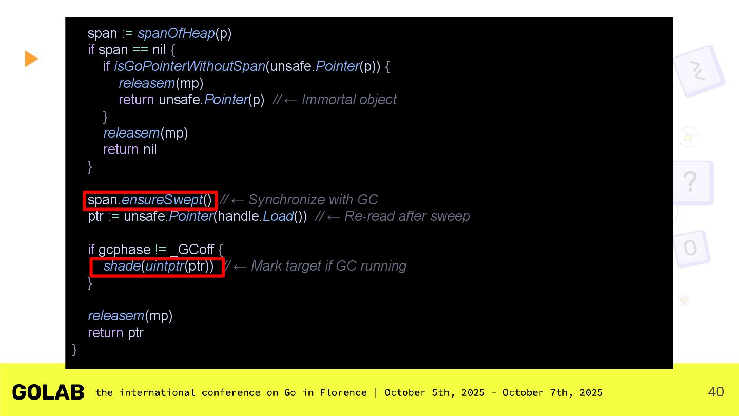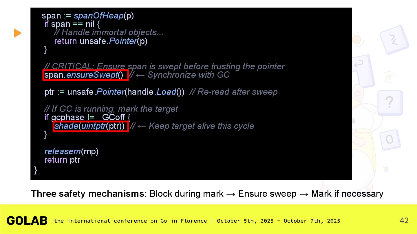 Handle immortal objects... return unsafe.Pointer(p) } // CRITICAL: Ensure span is swept before trusting the pointer span.ensureSwept() // ← Synchronize with GC ptr := unsafe.Pointer(handle.Load()) // Re-read after sweep // If GC is running, mark the target if gcphase != _GCoff { shade(uintptr(ptr)) // ← Keep target alive this cycle } releasem(mp) return ptr } Three safety mechanisms: Block during mark → Ensure sweep → Mark if necessary