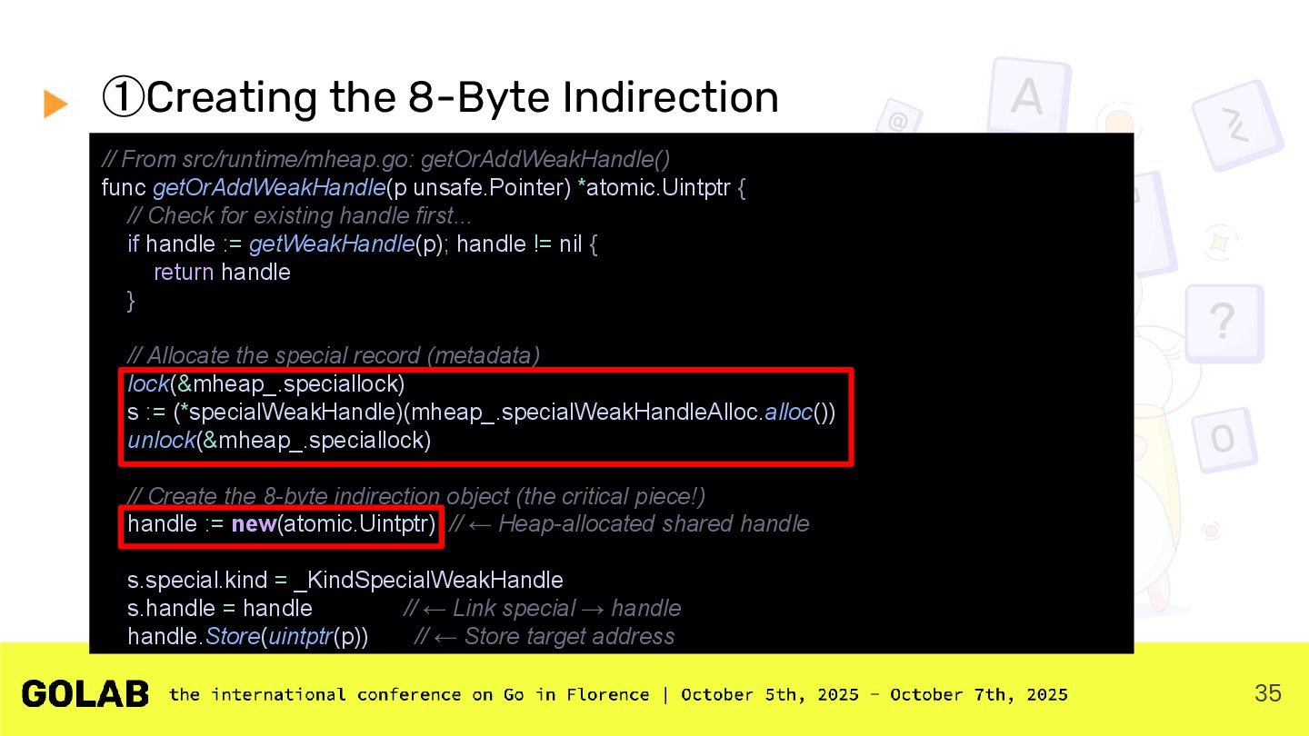 28. 35 ①Creating the 8-Byte Indirection // From src/runtime/mheap.go: getOrAddWeakHandle() func