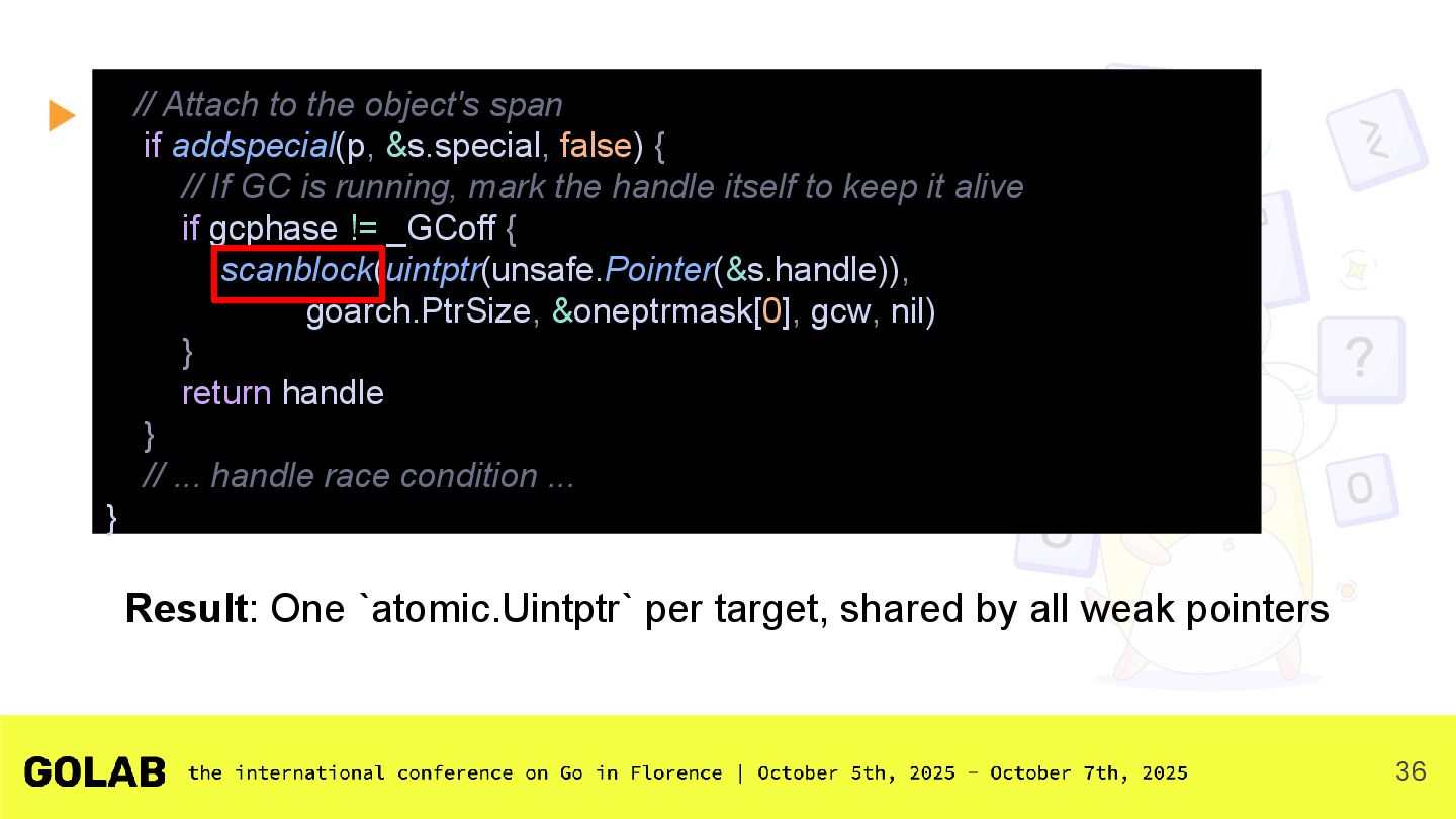 false) { // If GC is running, mark the handle itself to keep it alive if gcphase != _GCoff { scanblock(uintptr(unsafe.Pointer(&s.handle)), goarch.PtrSize, &oneptrmask[0], gcw, nil) } return handle } // ... handle race condition ... } Result: One `atomic.Uintptr` per target, shared by all weak pointers