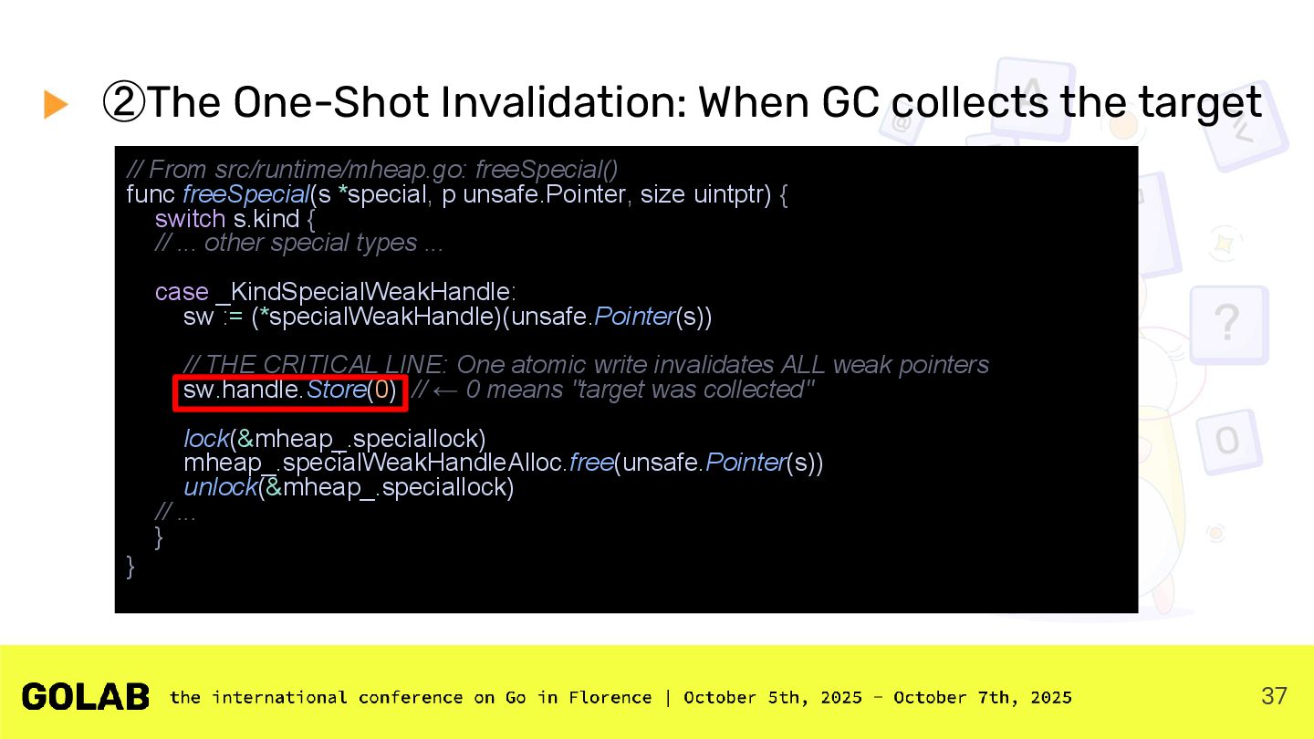 From src/runtime/mheap.go: freeSpecial() func freeSpecial(s *special, p unsafe.Pointer, size uintptr) { switch s.kind { // ... other special types ... case _KindSpecialWeakHandle: sw := (*specialWeakHandle)(unsafe.Pointer(s)) // THE CRITICAL LINE: One atomic write invalidates ALL weak pointers sw.handle.Store(0) // ← 0 means "target was collected" lock(&mheap_.speciallock) mheap_.specialWeakHandleAlloc.free(unsafe.Pointer(s)) unlock(&mheap_.speciallock) // ... } }