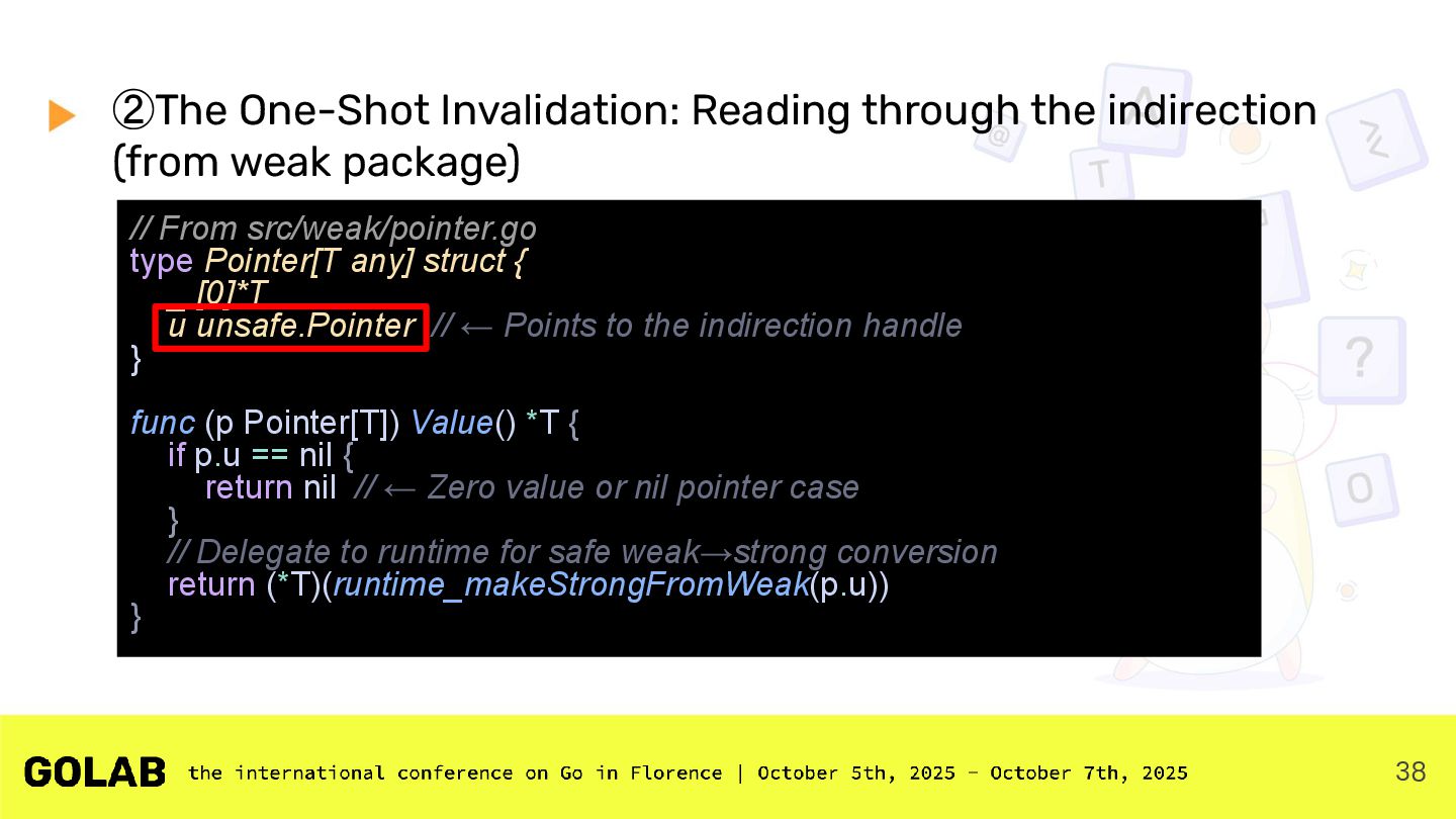 isGoPointerWithoutSpan(unsafe.Pointer(p)) { releasem(mp) return unsafe.Pointer(p) // ← Immortal object } releasem(mp) return nil } span.ensureSwept() // ← Synchronize with GC ptr := unsafe.Pointer(handle.Load()) // ← Re-read after sweep if gcphase != _GCoff { shade(uintptr(ptr)) // ← Mark target if GC running } releasem(mp) return ptr }