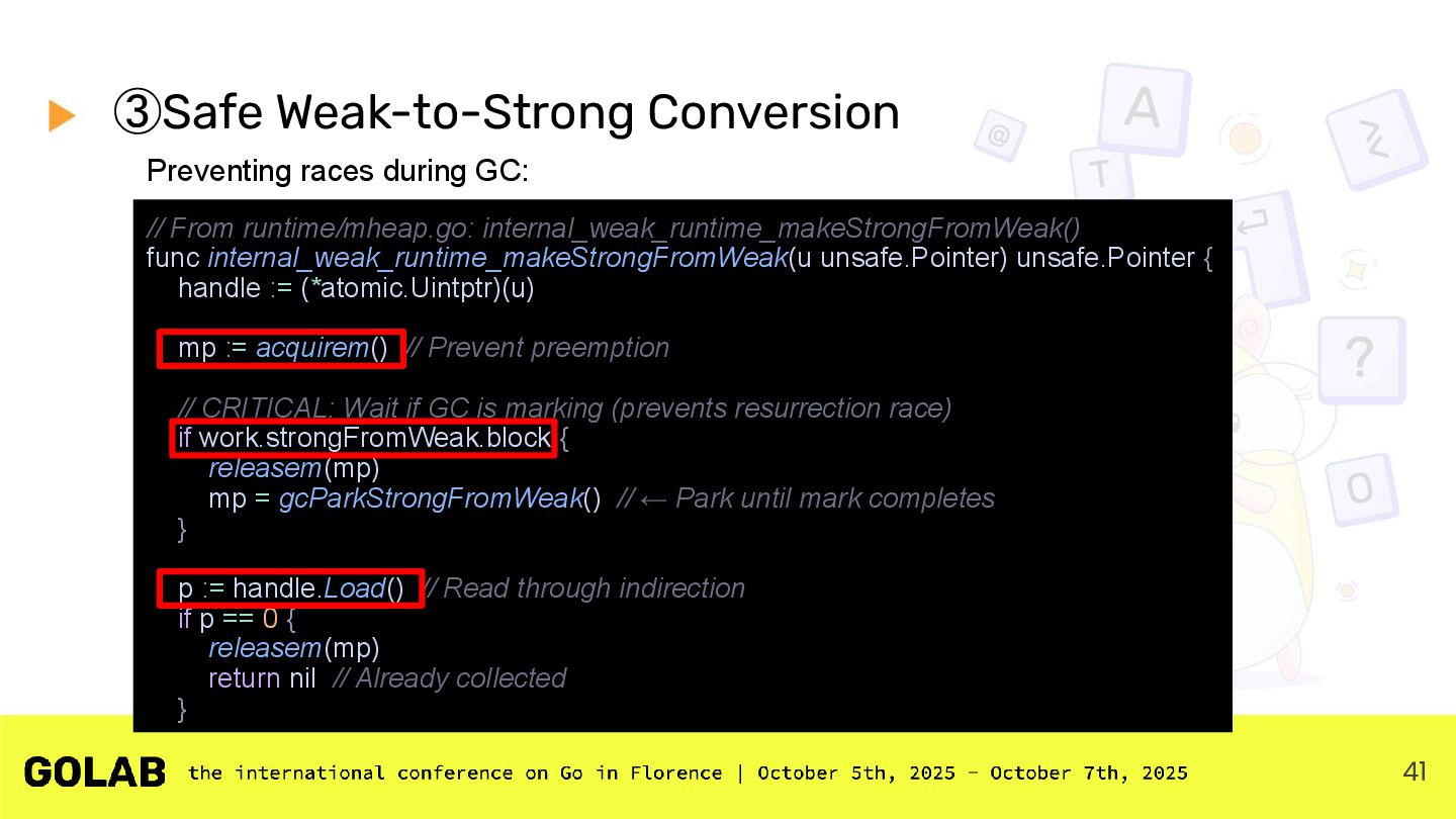 unsafe.Pointer) unsafe.Pointer { handle := (*atomic.Uintptr)(u) mp := acquirem() // Prevent preemption // CRITICAL: Wait if GC is marking (prevents resurrection race) if work.strongFromWeak.block { releasem(mp) mp = gcParkStrongFromWeak() // ← Park until mark completes } p := handle.Load() // Read through indirection if p == 0 { releasem(mp) return nil // Already collected } Preventing races during GC: