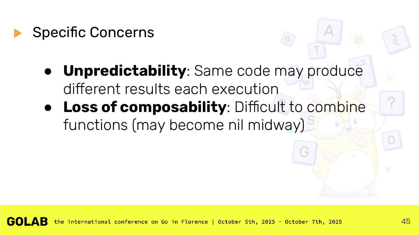 results each execution • Loss of composability: Difficult to combine functions (may become nil midway)