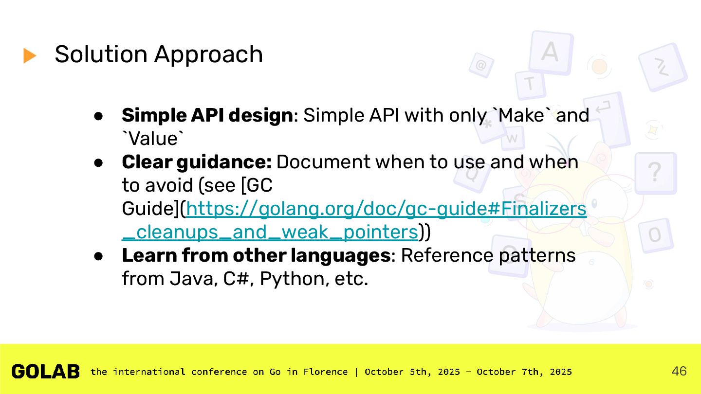 only `Make` and `Value` • Clear guidance: Document when to use and when to avoid (see [GC Guide](https://golang.org/doc/gc-guide#Finalizers _cleanups_and_weak_pointers)) • Learn from other languages: Reference patterns from Java, C#, Python, etc.